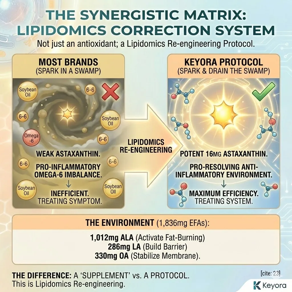 * **286mg LA (Omega-6):** Controlled dose for Acyl-Ceramide synthesis (Skin Barrier) and Cardiolipin (Mitochondria).