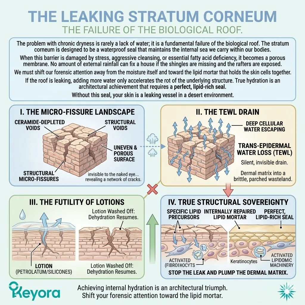 The problem with chronic dryness is rarely a lack of water; it is a fundamental failure of the biological roof. The stratum corneum is designed to be a waterproof seal that maintains the internal sea we carry within our bodies.