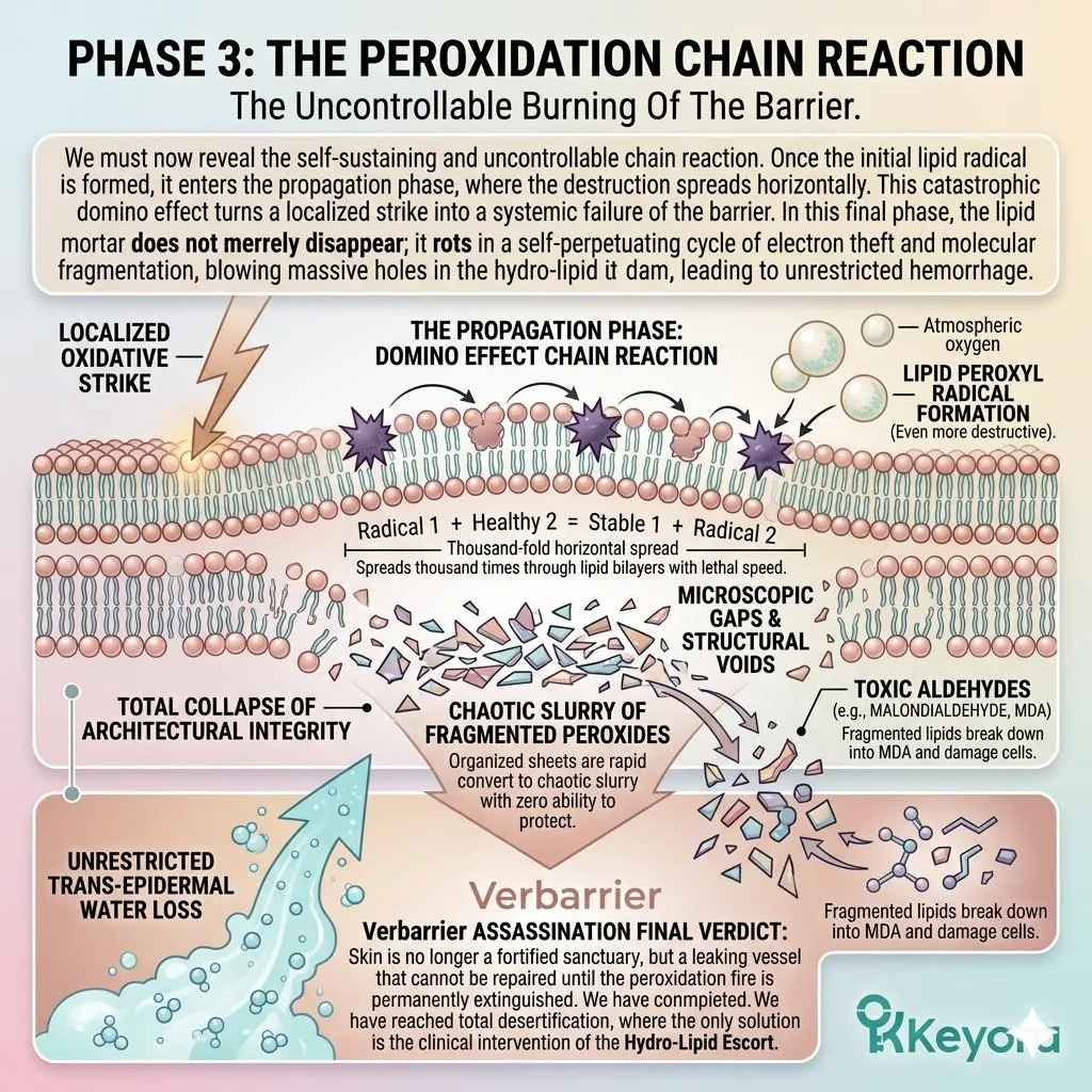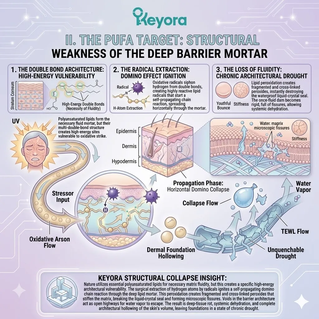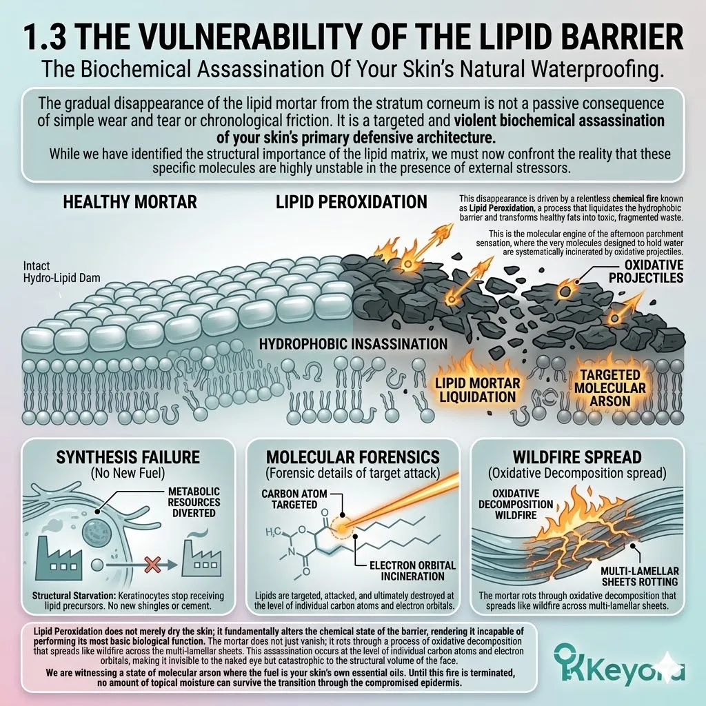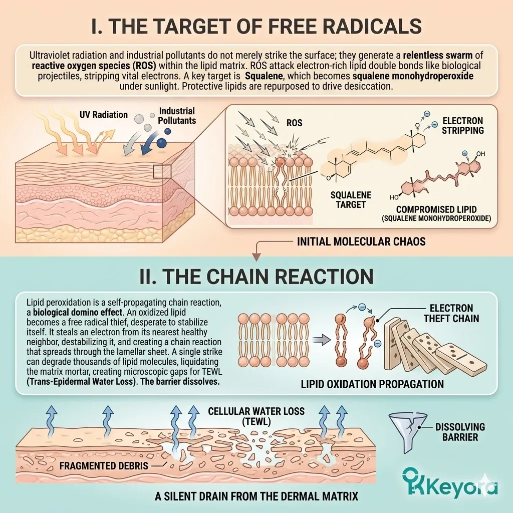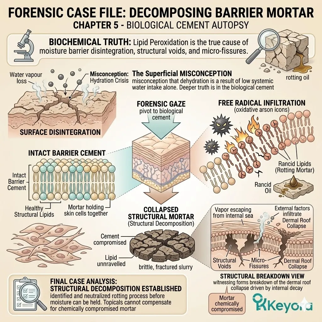 Once these lipids are compromised, they no longer function as a waterproof sealant. Instead, they become the starting point for a deeper, more aggressive form of tissue degradation. The very molecules intended to keep you hydrated are repurposed by free radicals to drive your internal desiccation.