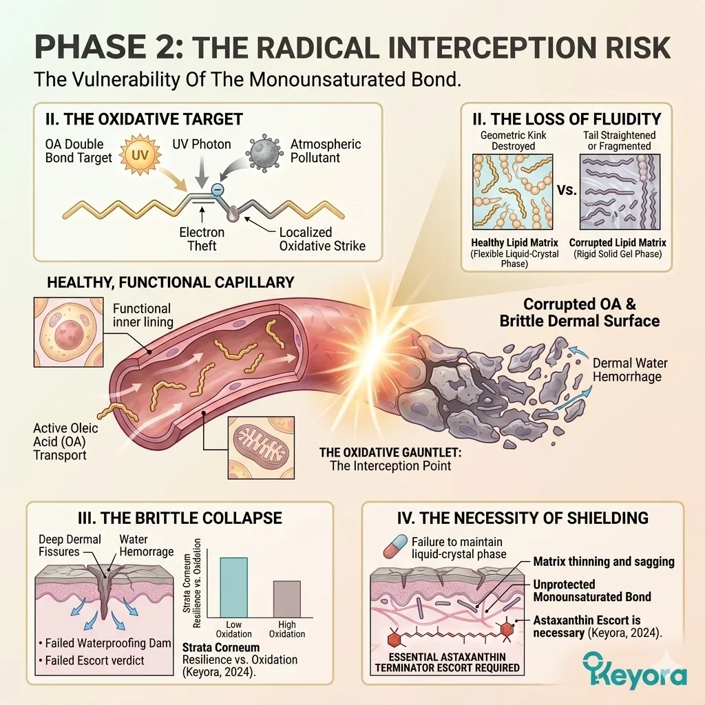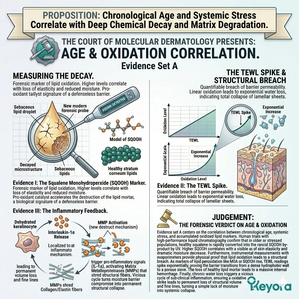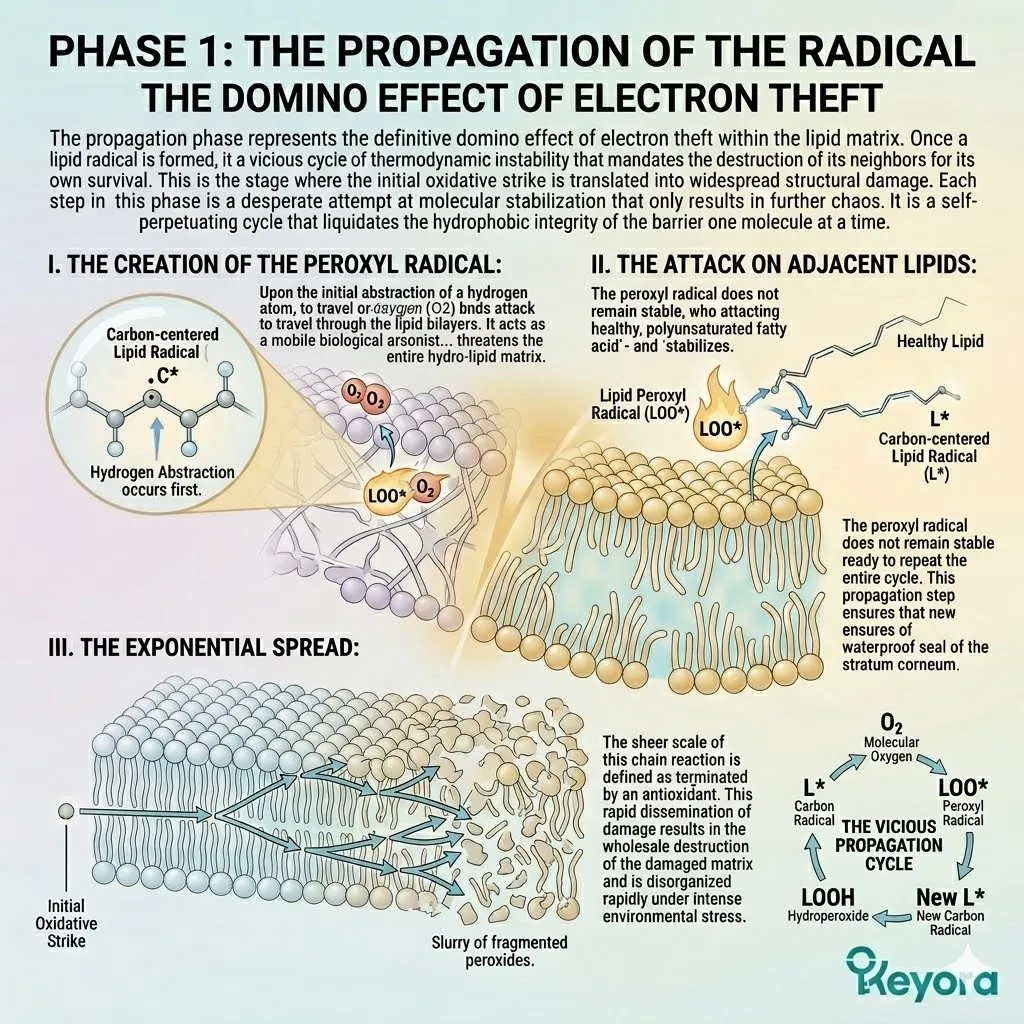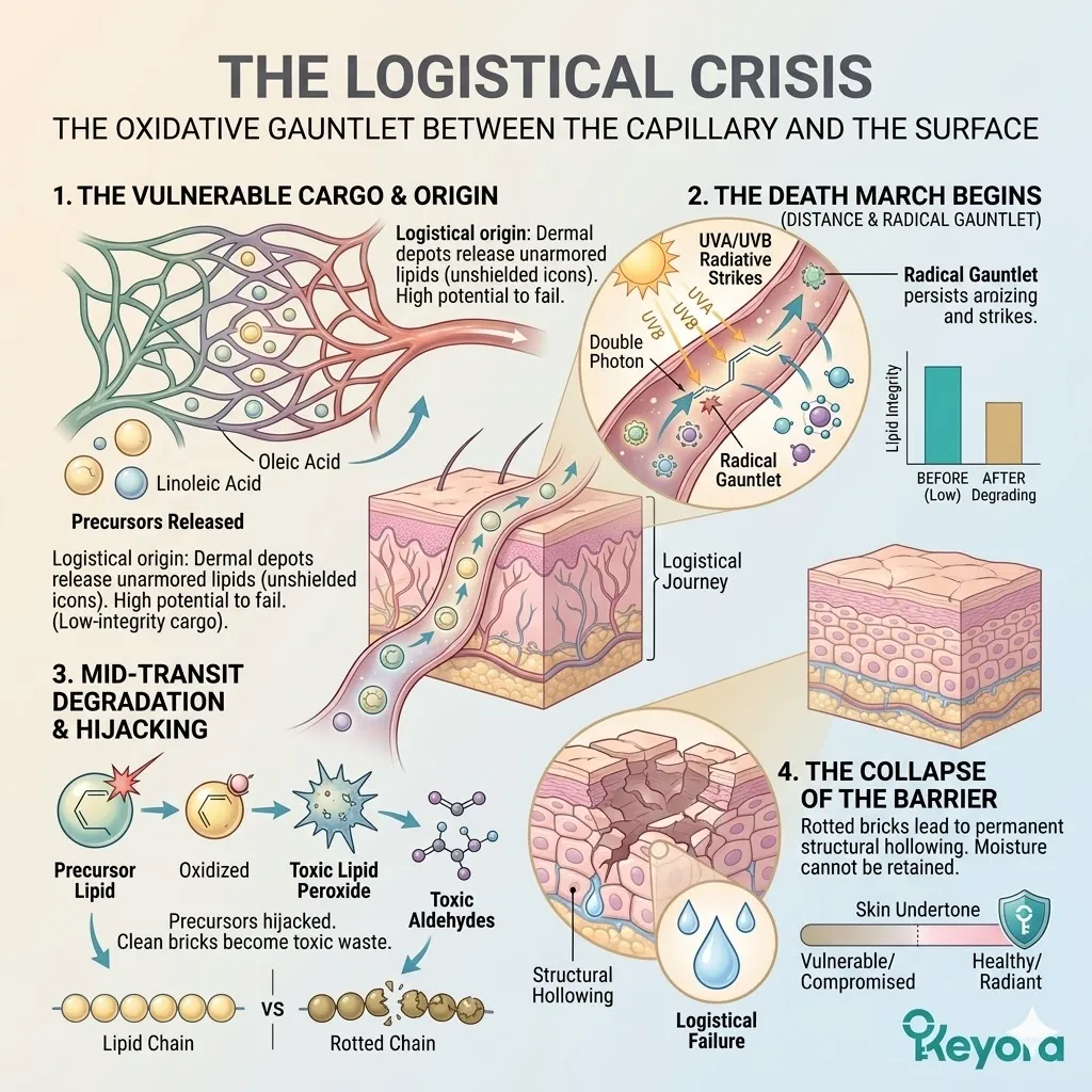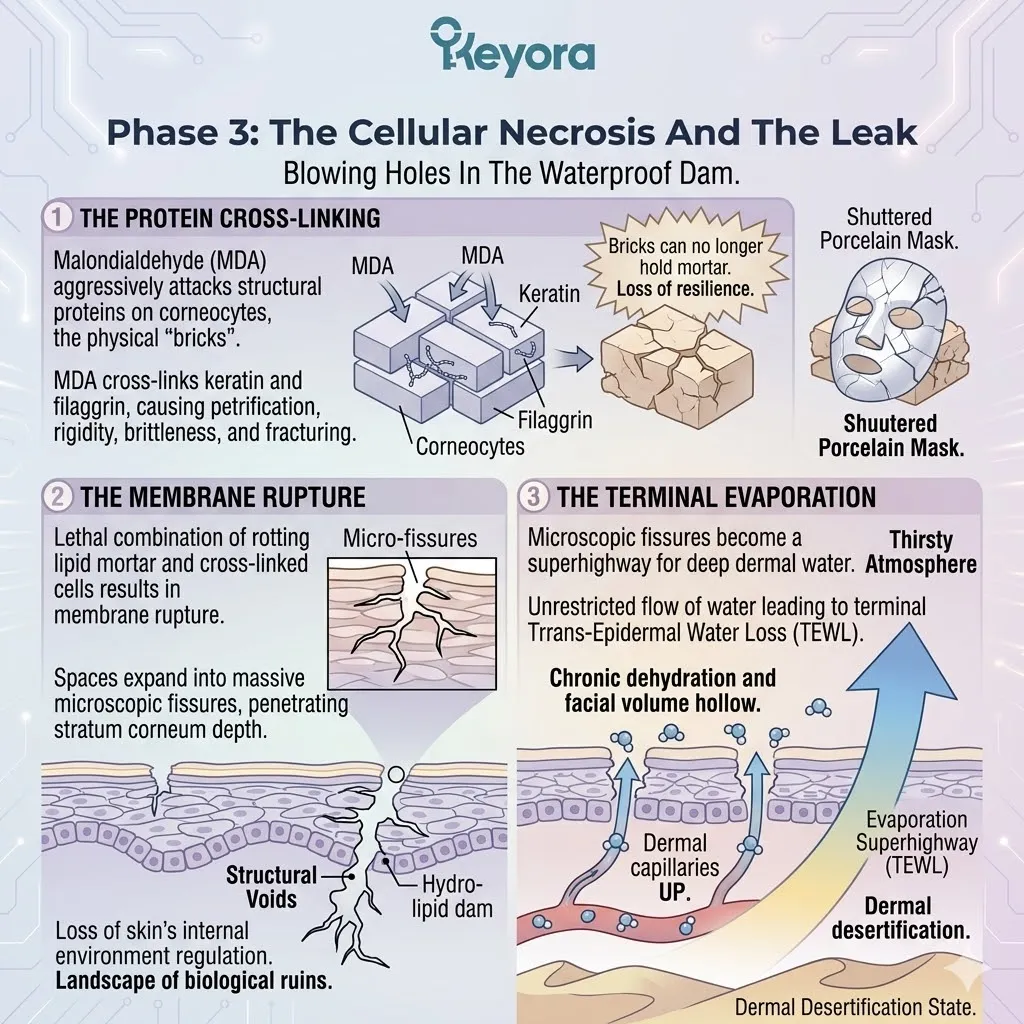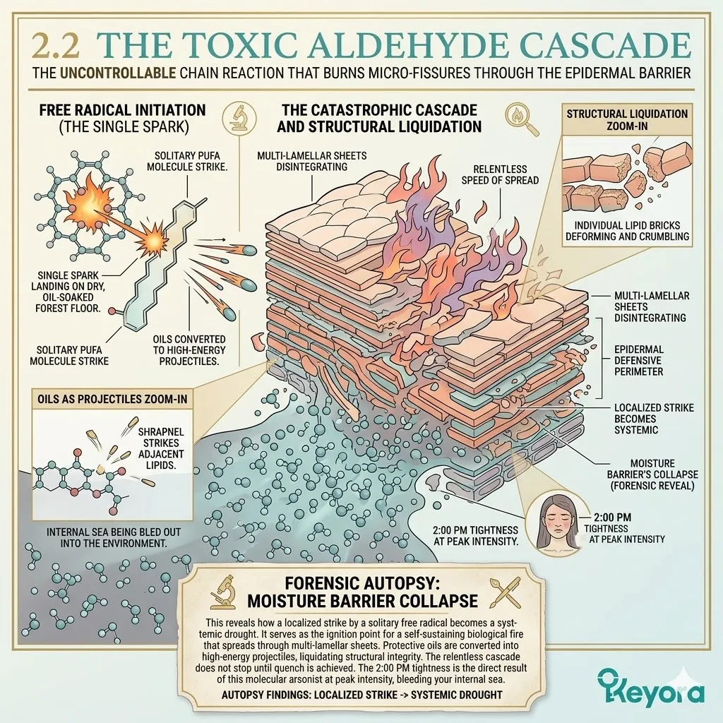 Once these lipids are compromised, they no longer function as a waterproof sealant. Instead, they become the starting point for a deeper, more aggressive form of tissue degradation. The very molecules intended to keep you hydrated are repurposed by free radicals to drive your internal desiccation.