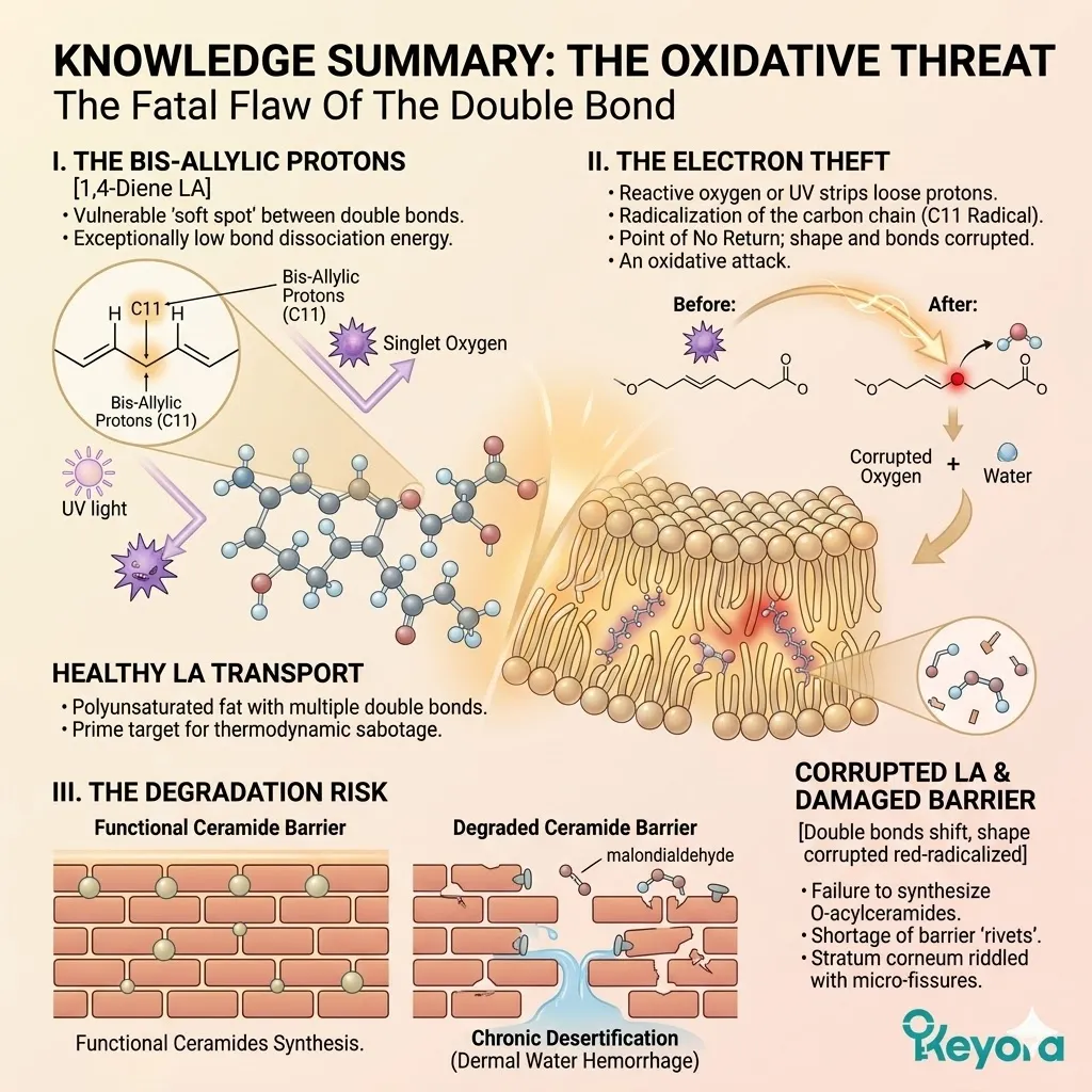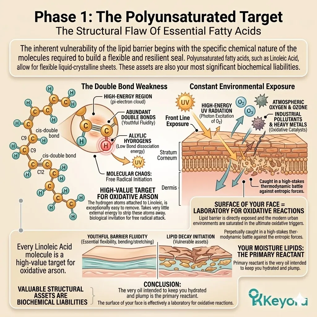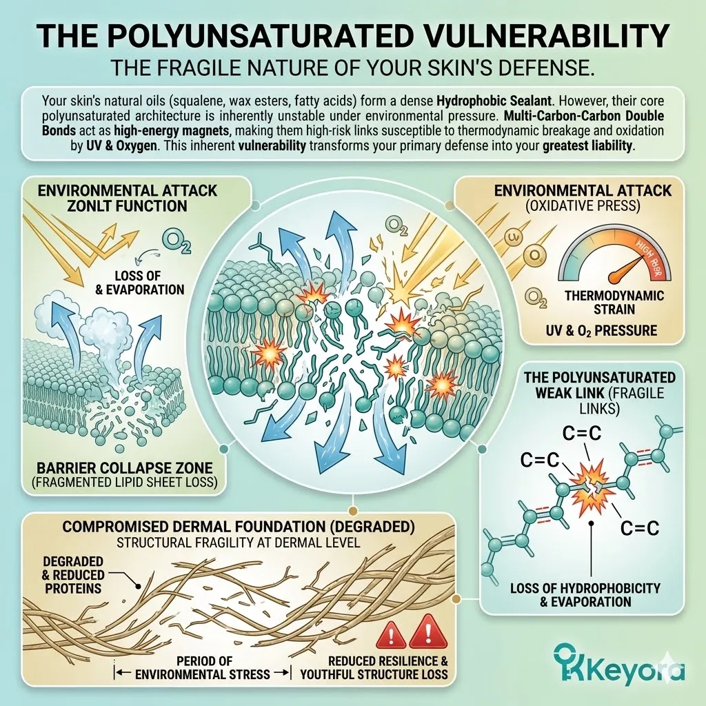 The primary vulnerability lies in the polyunsaturated nature of these skin lipids, which contain multiple carbon-carbon double bonds. While these double bonds provide the necessary fluidity for the barrier to bend, they act as high-energy magnets for oxidative attack.