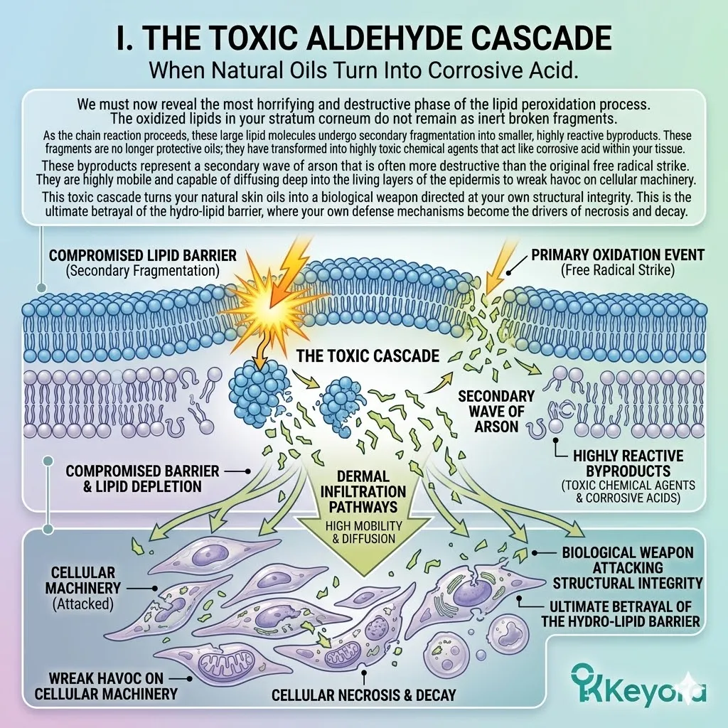 As the chain reaction proceeds, these large lipid molecules undergo secondary fragmentation into smaller, highly reactive byproducts. These fragments are no longer protective oils; they have transformed into highly toxic chemical agents that act like corrosive acid within your tissue.