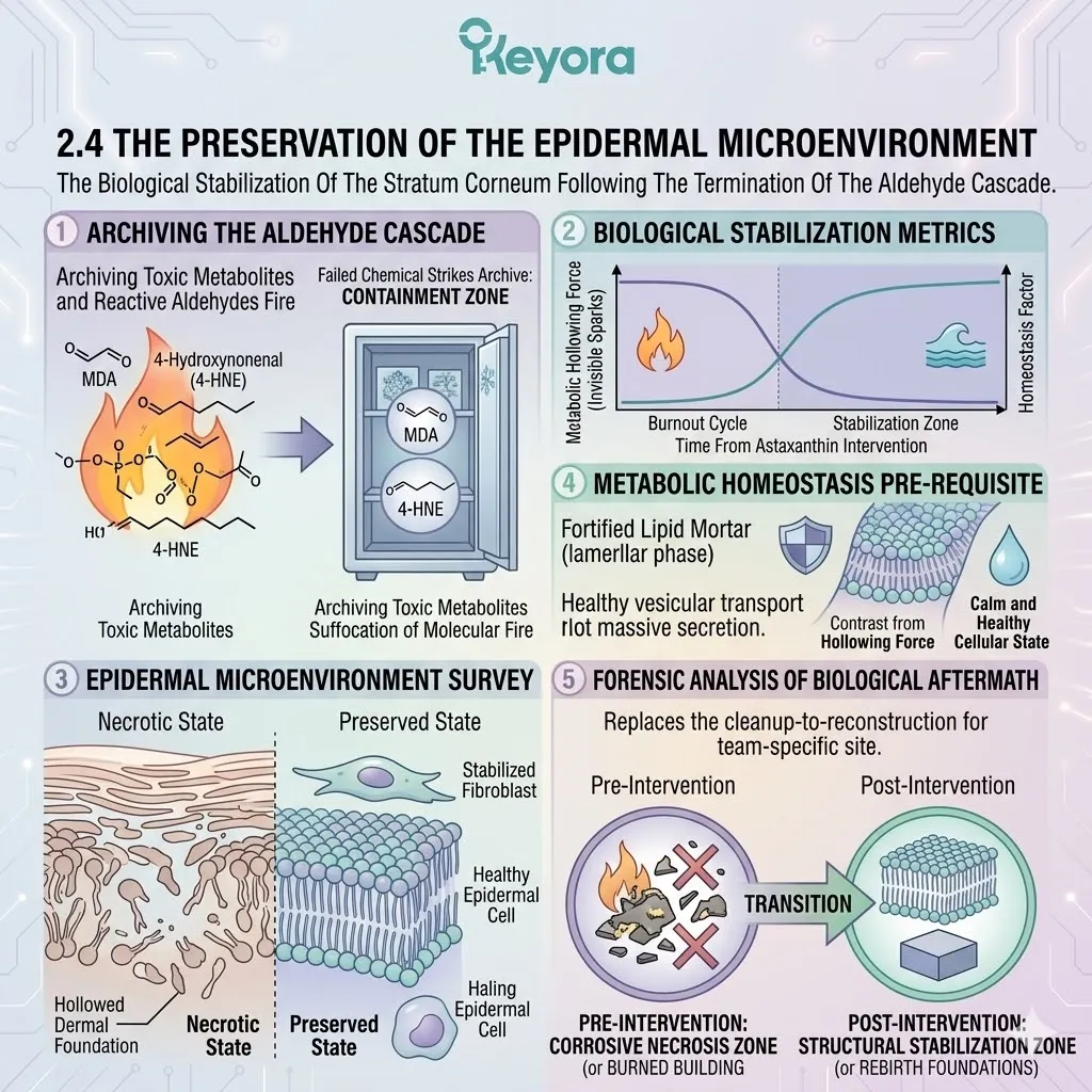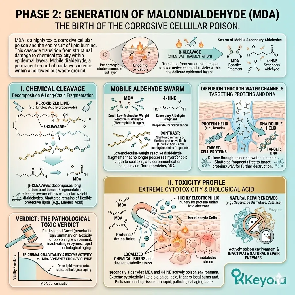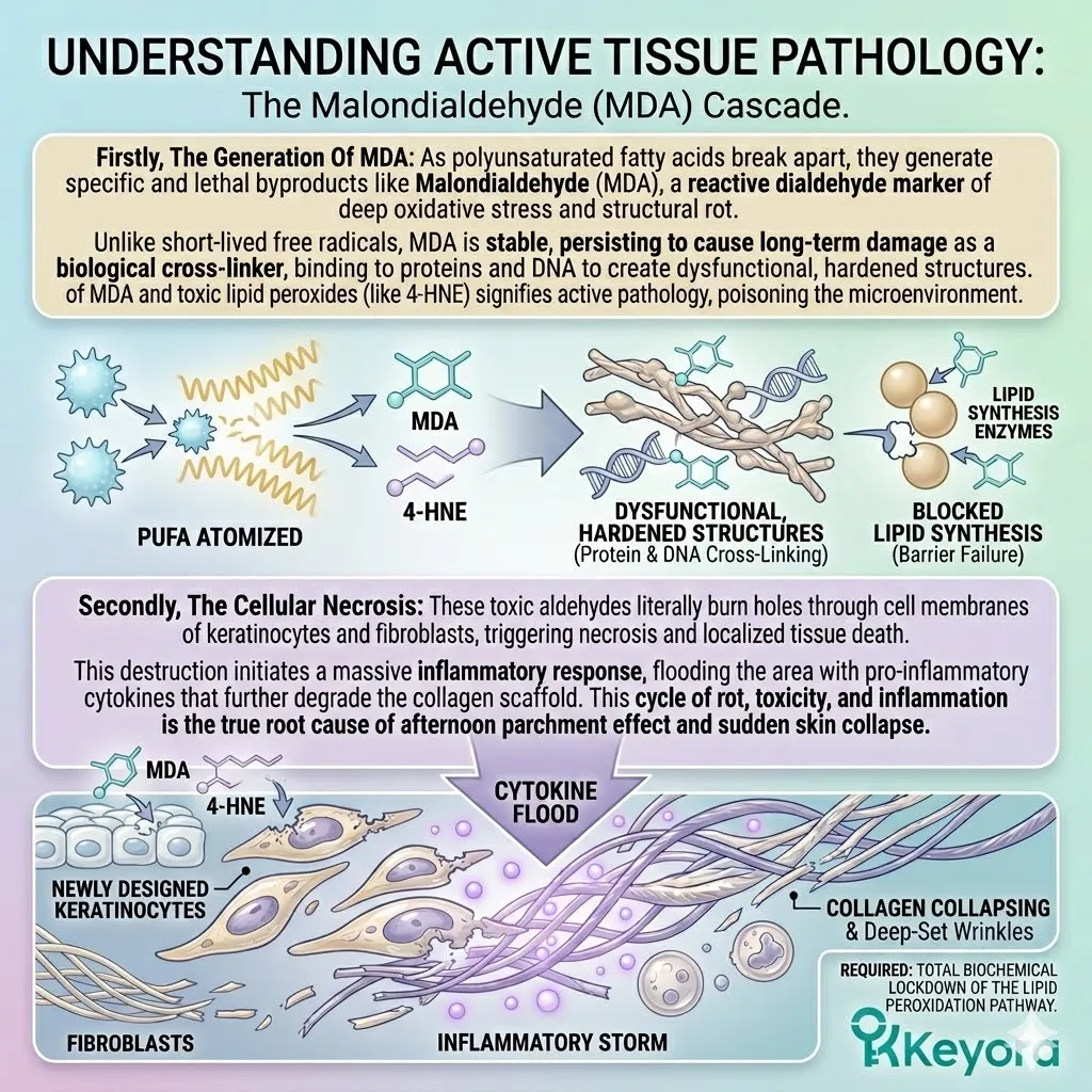 The creation of MDA and other toxic lipid peroxides, such as 4-hydroxynonenal (4-HNE), signifies the total transition from simple dryness to active tissue pathology. These molecules do not just allow water to escape; they actively poison the microenvironment.