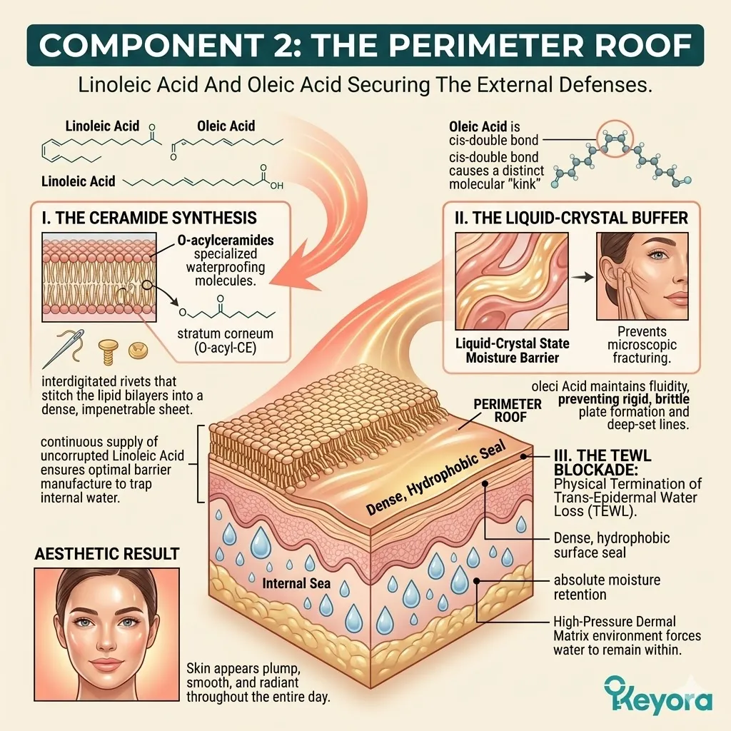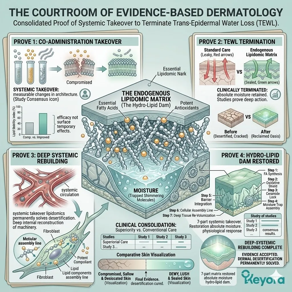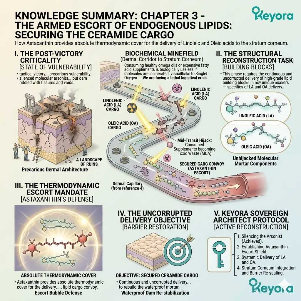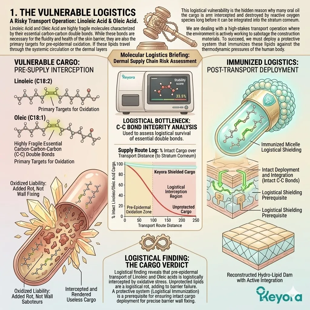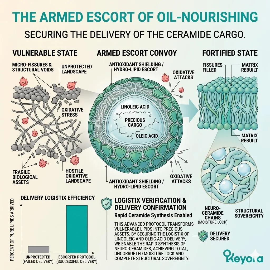 By silencing the inflammatory pathways and quenching the cytokine fire, we have stopped the biological scissors from liquidating your dermal foundations. Simultaneously, we have successfully forged the waterproof seal of the stratum corneum by providing the essential structural cargo of Linoleic Acid and Oleic Acid.