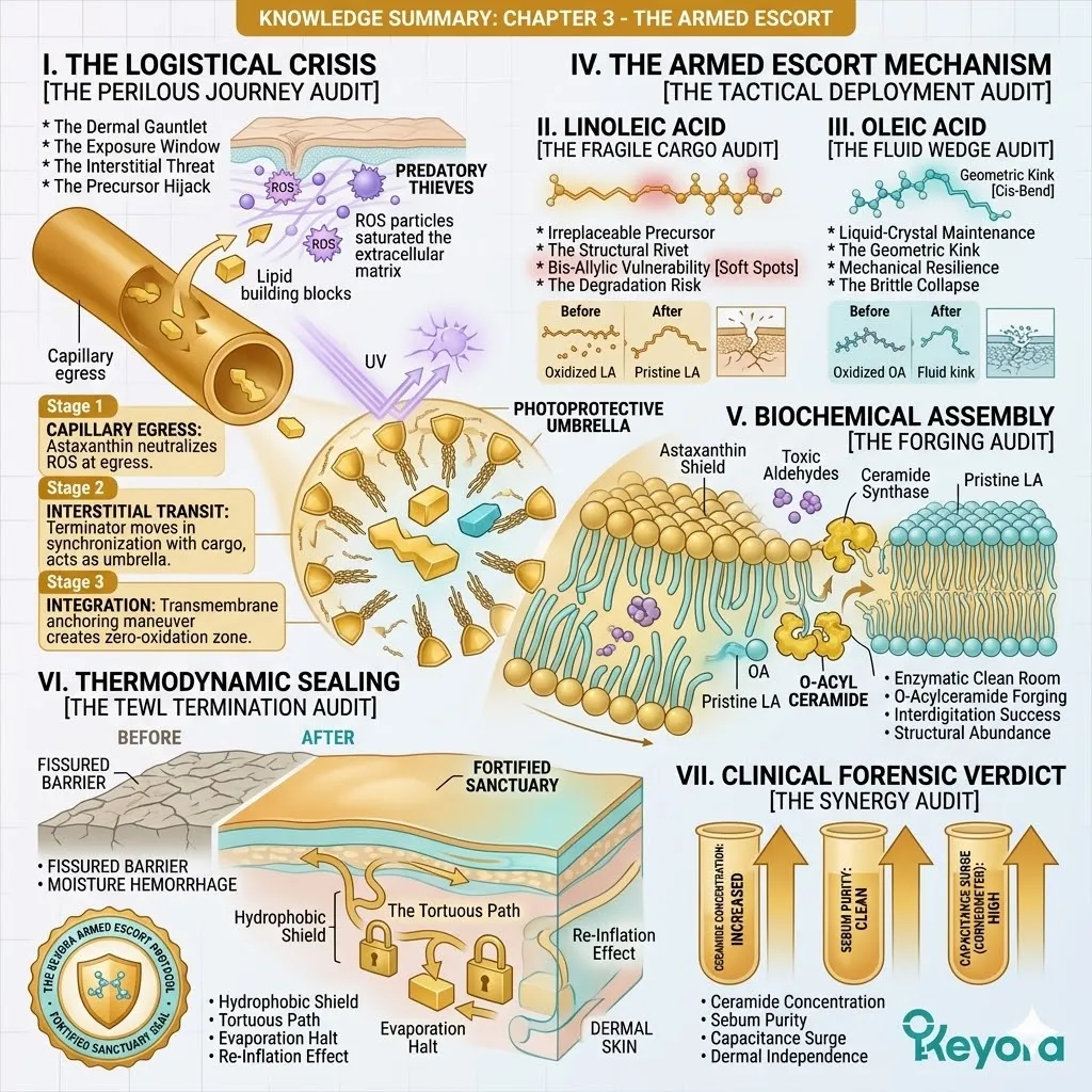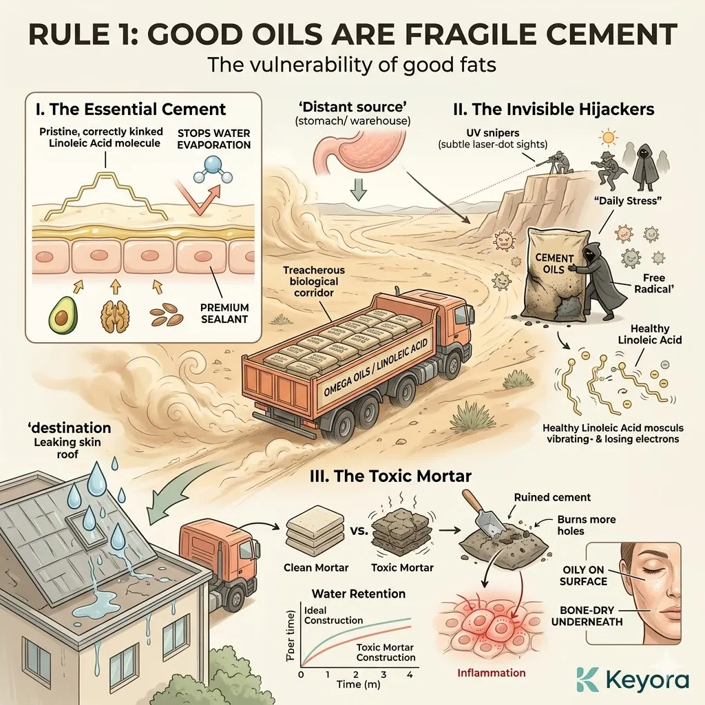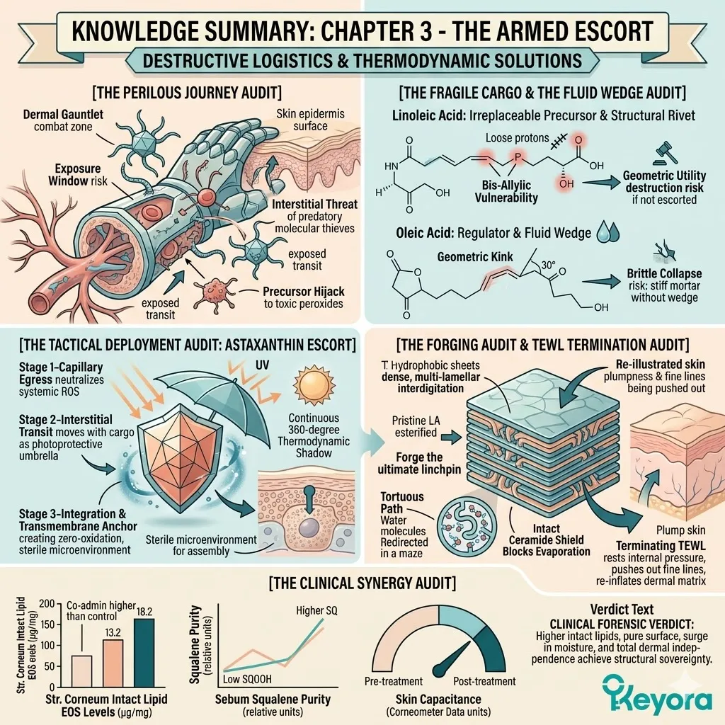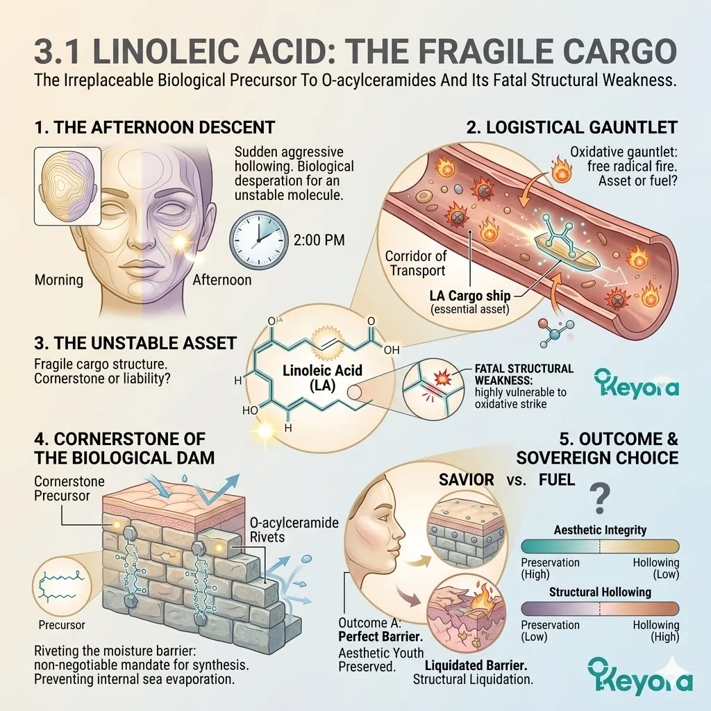 By silencing the inflammatory pathways and quenching the cytokine fire, we have stopped the biological scissors from liquidating your dermal foundations. Simultaneously, we have successfully forged the waterproof seal of the stratum corneum by providing the essential structural cargo of Linoleic Acid and Oleic Acid.