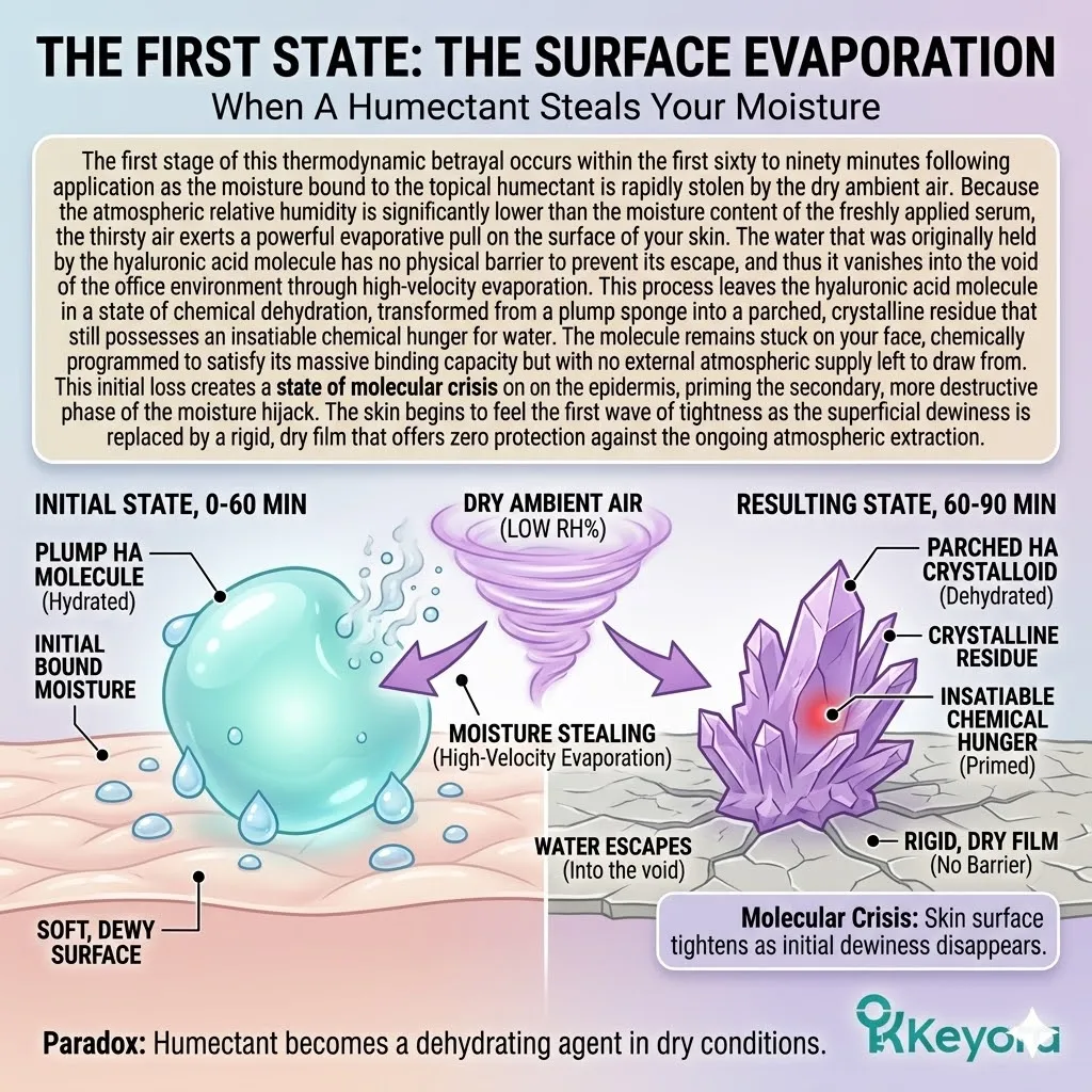 This evaporation process happens rapidly, often within the first few hours of your workday. As the topical water vanishes, the humectant remains on the surface, still chemically programmed to satisfy its affinity for moisture. It no longer has an external supply to draw from.