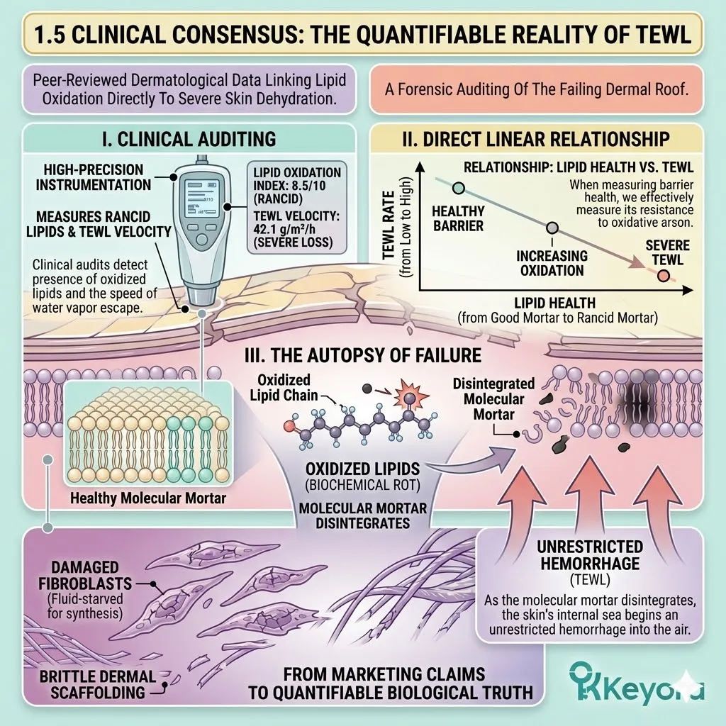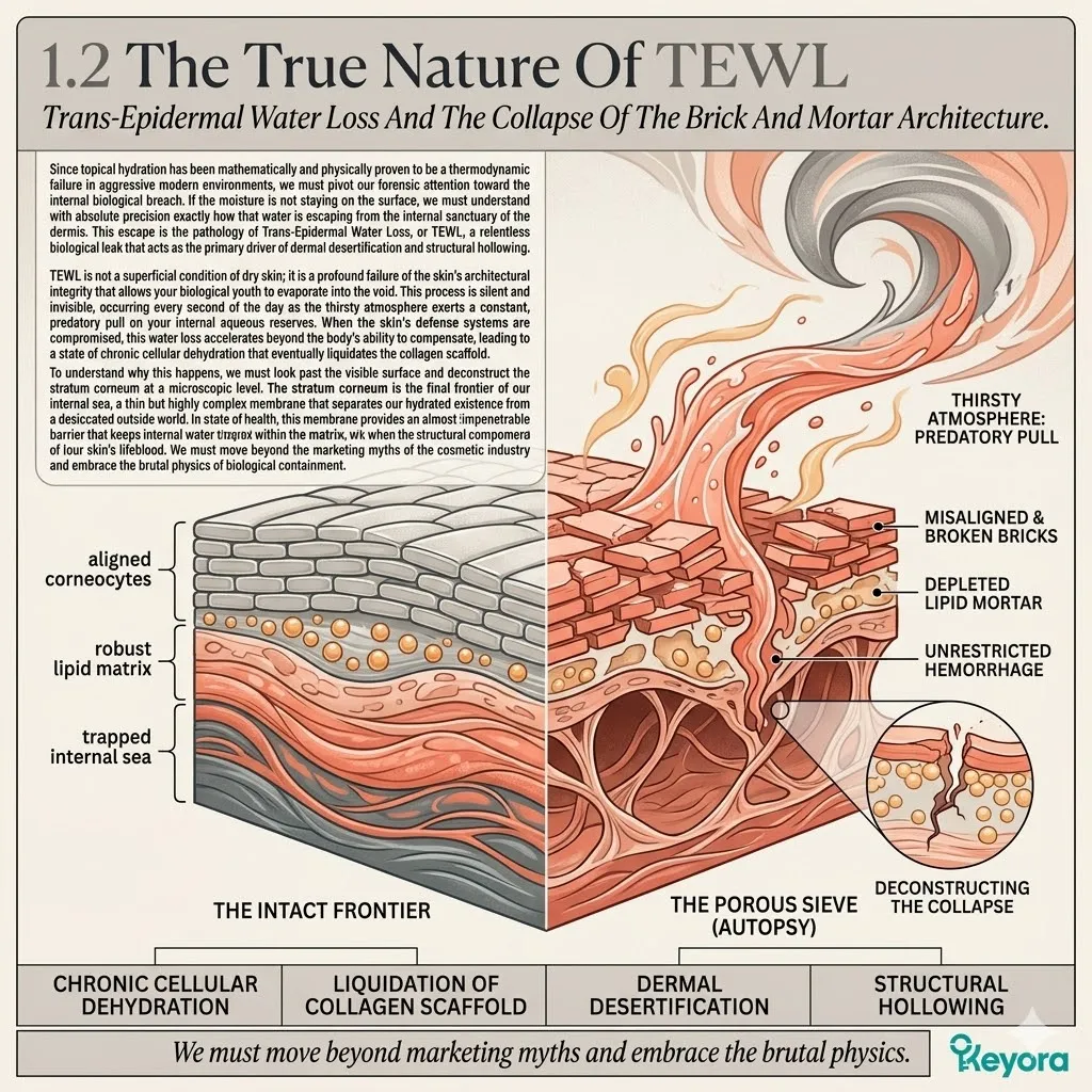 A compromised lipid barrier is a landscape of microscopic disaster that is invisible to the naked eye. Under high-resolution imaging, a stressed stratum corneum reveals a network of micro-fissures and structural voids where essential ceramides should be. These cracks act as open windows, allowing deep cellular water to constantly escape into the atmosphere through evaporation. This process is clinically defined as Trans-Epidermal Water Loss, or TEWL.