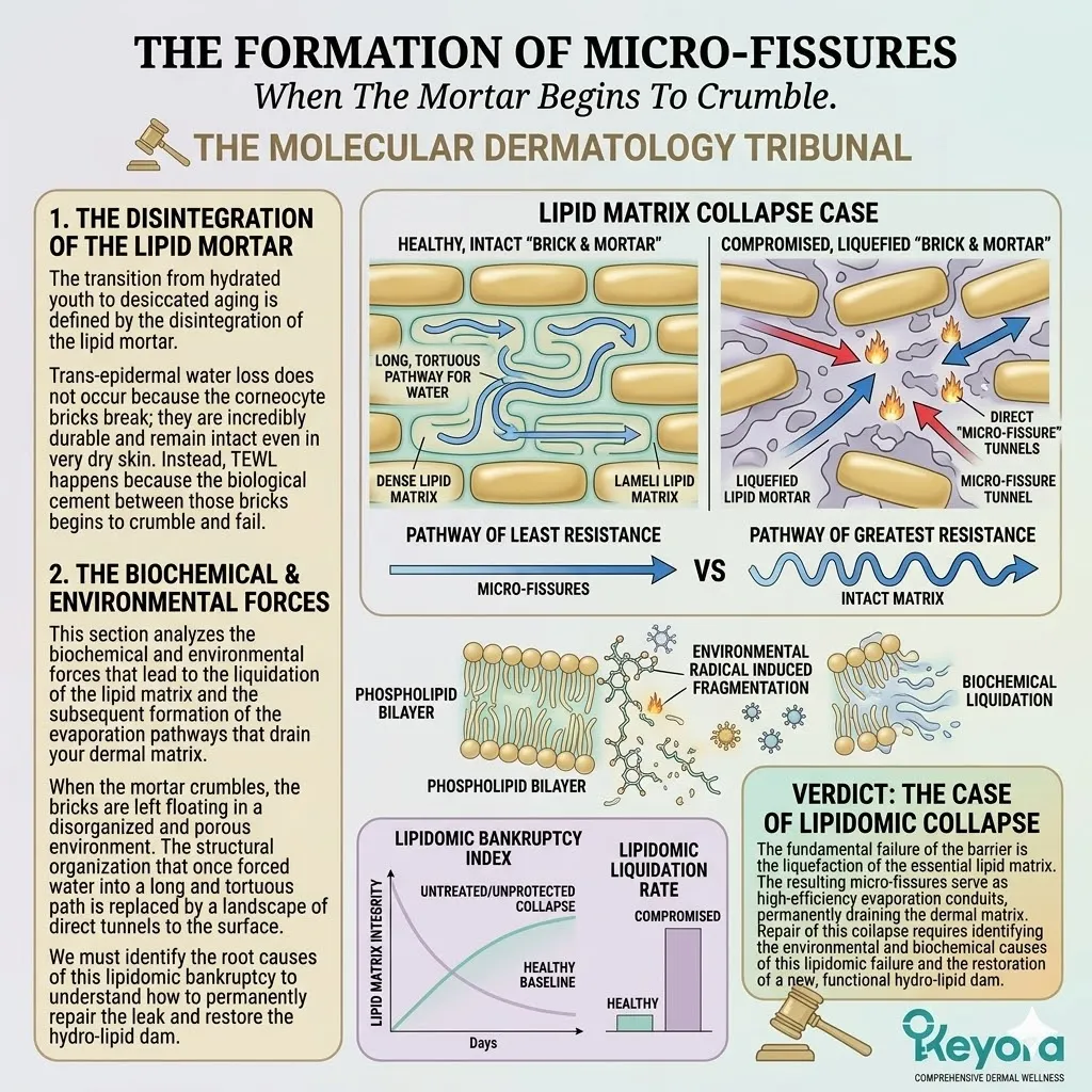 The organized stacking of the mortar is liquidated, creating the microscopic gaps that allow cellular water to escape at an accelerated rate. This is the biochemical mechanism of trans-epidermal water loss.