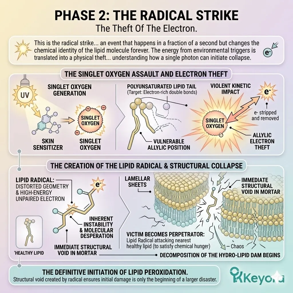 These ROS, particularly singlet oxygen and hydroxyl radicals, are forensic scavengers that specifically target the electron-rich double bonds of your skin oils. They act like biological projectiles, striking the lipid molecules and stripping away vital electrons to satisfy their own chemical instability.
