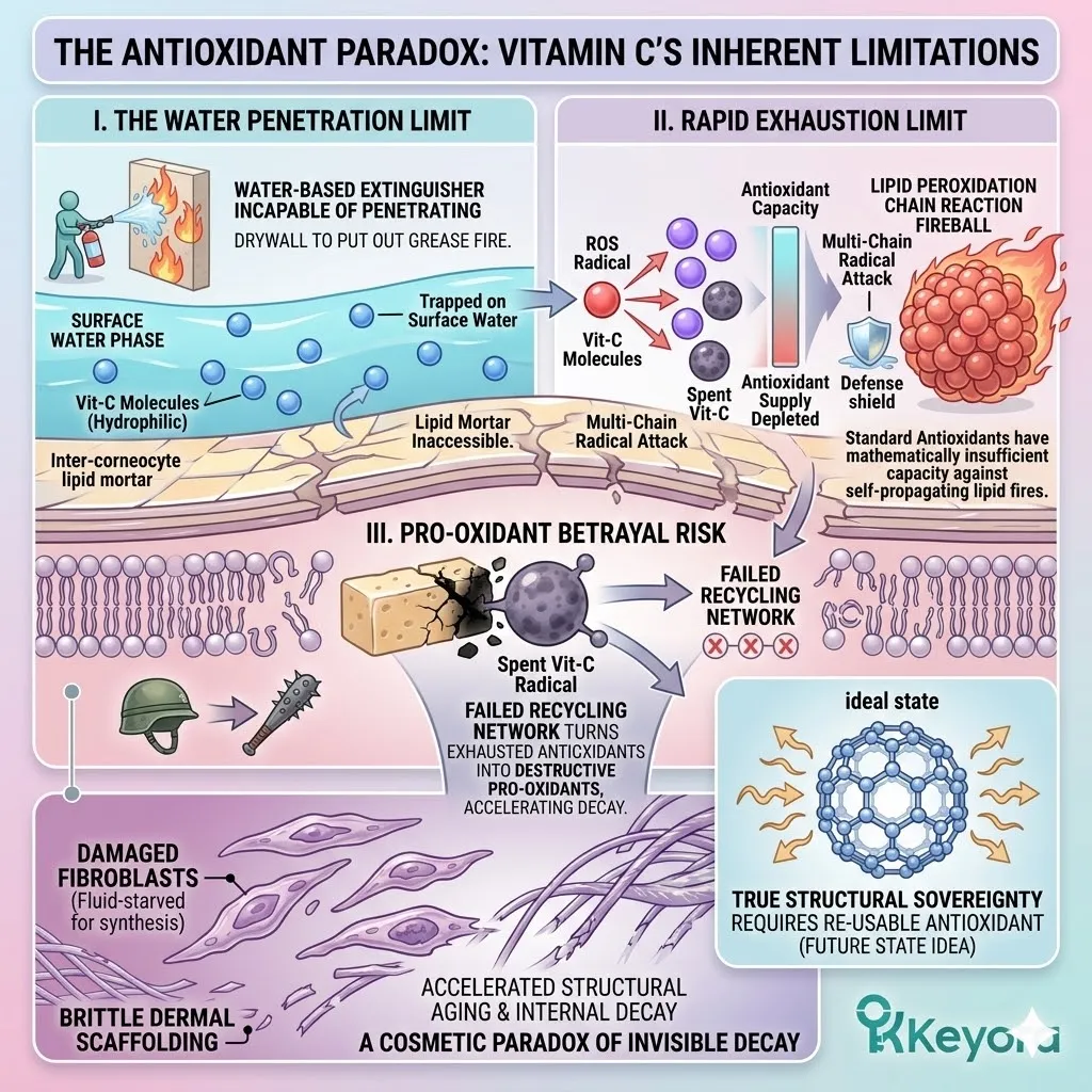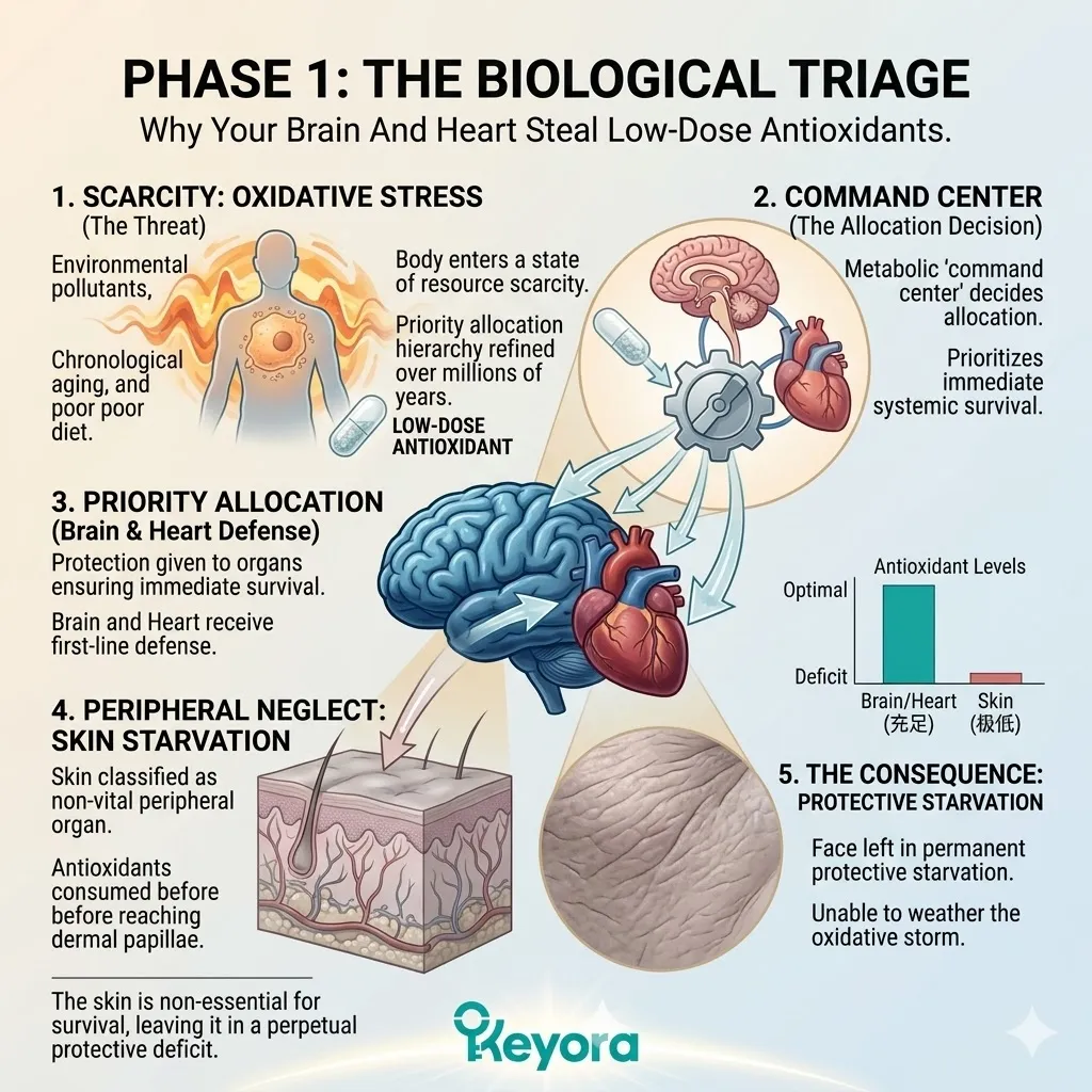* **The Neural/Cardiac Siphon:** Low doses of antioxidants are instantly siphoned by the “Neural Vacuum” and “Cardiac Demand,” leaving the skin starved.