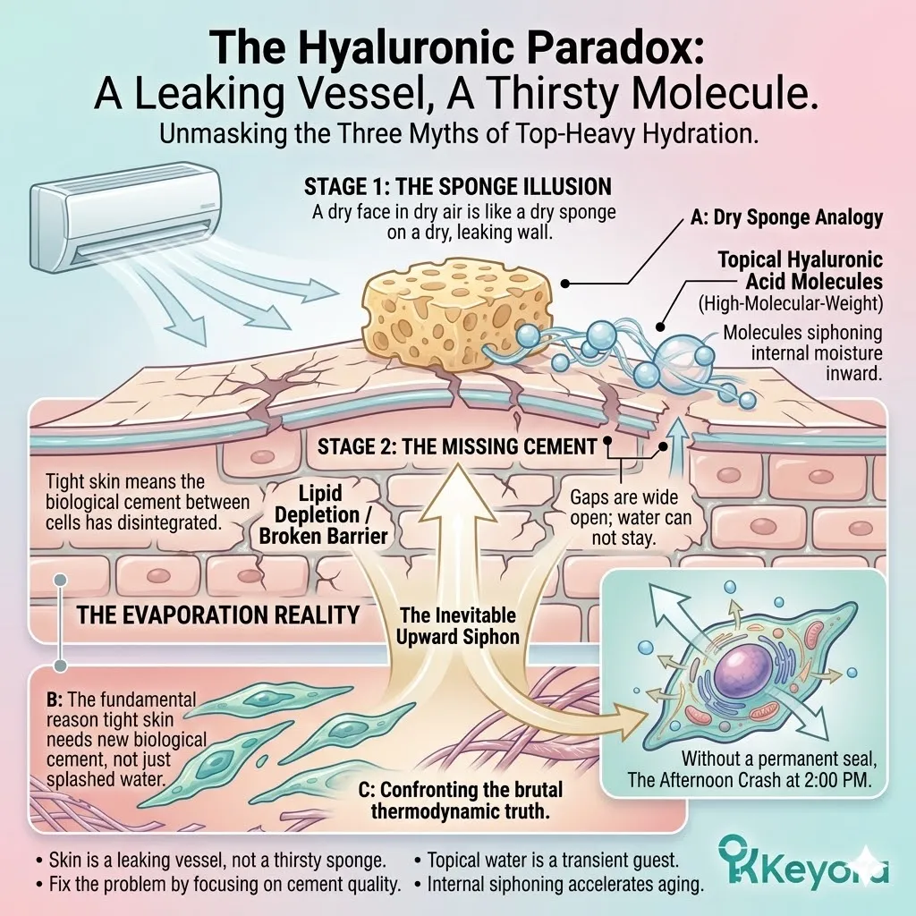 This is the cruel irony of top-heavy hydration strategies that the cosmetic industry refuses to disclose. When the surface humectant loses its external water to evaporation, it begins to satisfy its chemical hunger by pulling moisture upward from your deep dermal reserves.