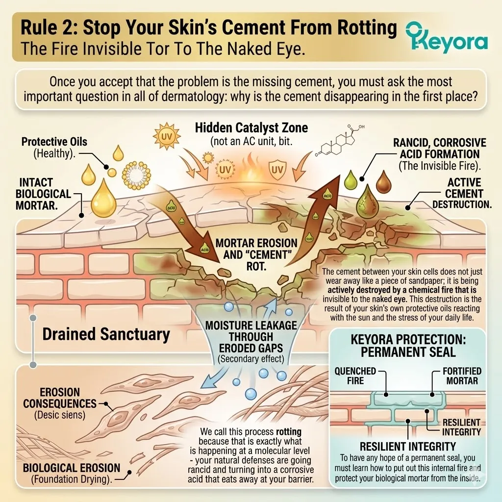 This toxic cascade turns your natural skin oils into a biological weapon directed at your own structural integrity. This is the ultimate betrayal of the hydro-lipid barrier, where your own defense mechanisms become the drivers of necrosis and decay.