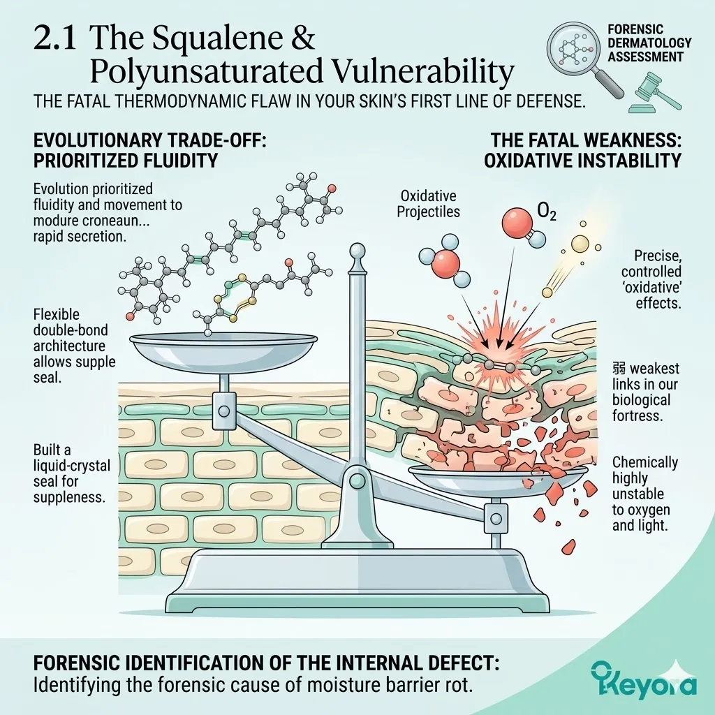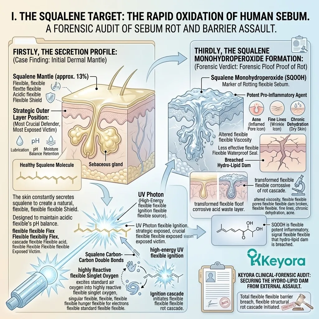 The presence of squalene on the skin surface makes it a primary target for this radiative arson. Squalene contains six double bonds, making it exceptionally vulnerable to becoming squalene monohydroperoxide when exposed to sunlight.