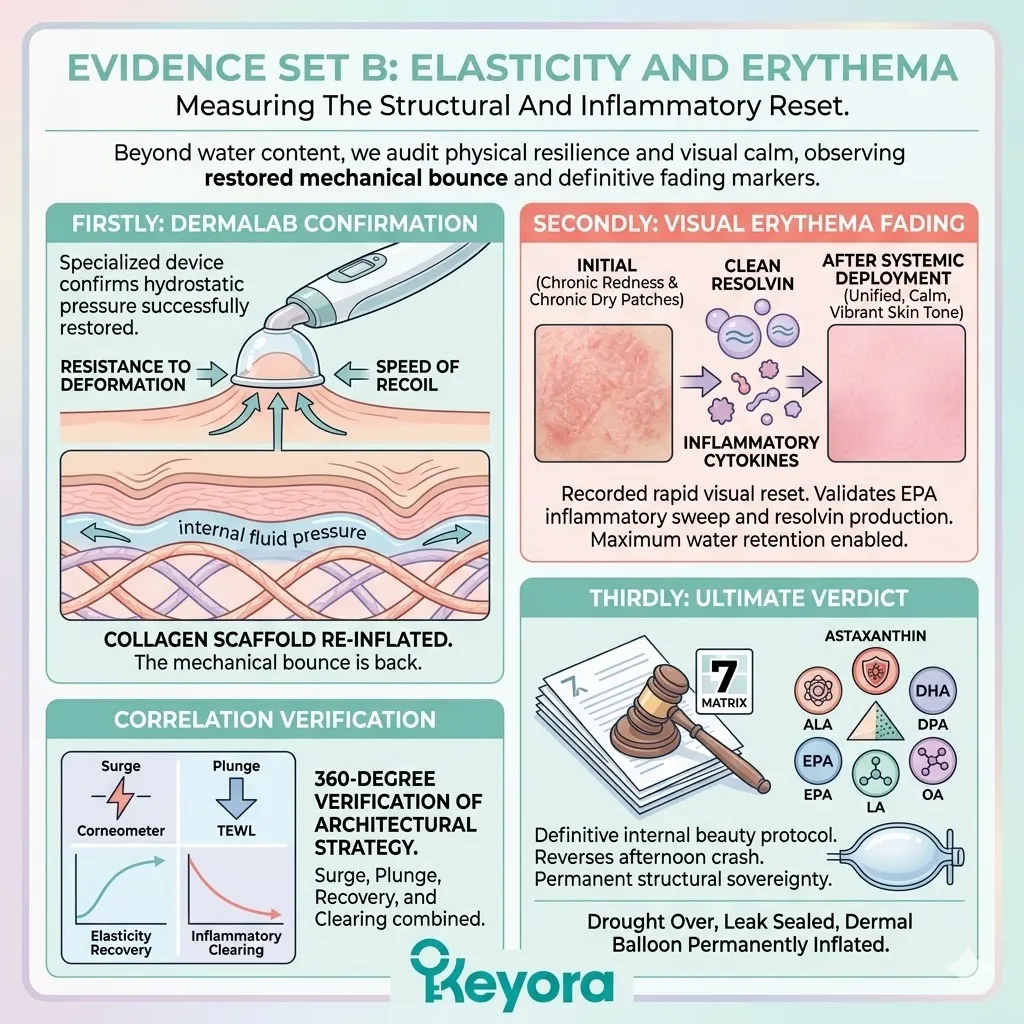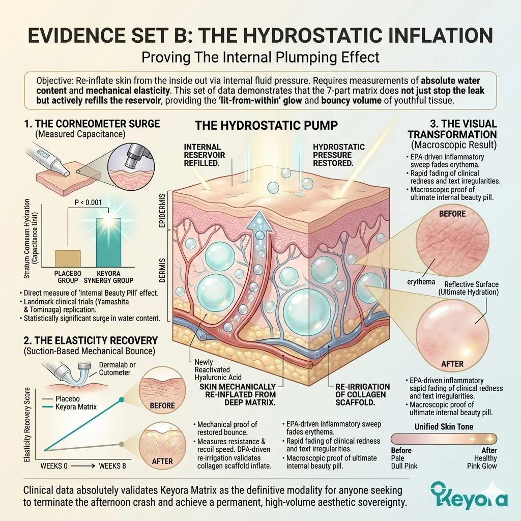 * **Elasticity Recovery:** Dermalab confirmation that internal hydrostatic pressure restores the mechanical “bounce” and recoil of the skin.