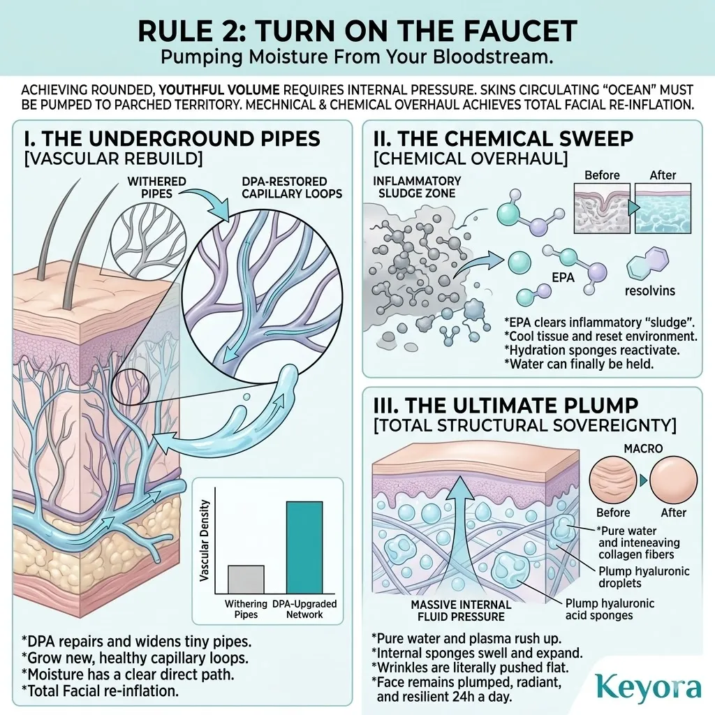 The water is running again, forcefully delivered by a rebuilt vascular plumbing system that pumps absolute hydration into the deepest foundations of your tissue matrix.