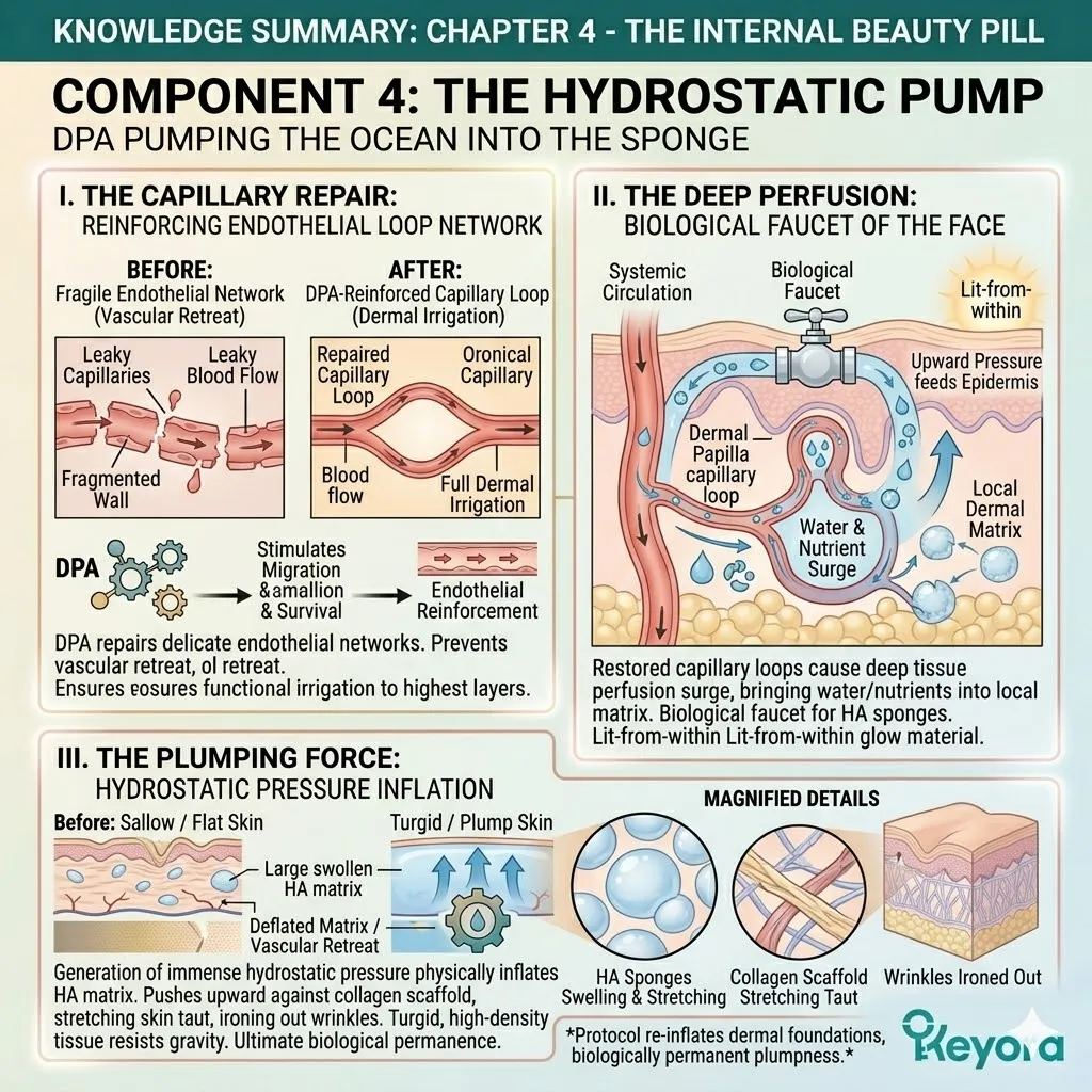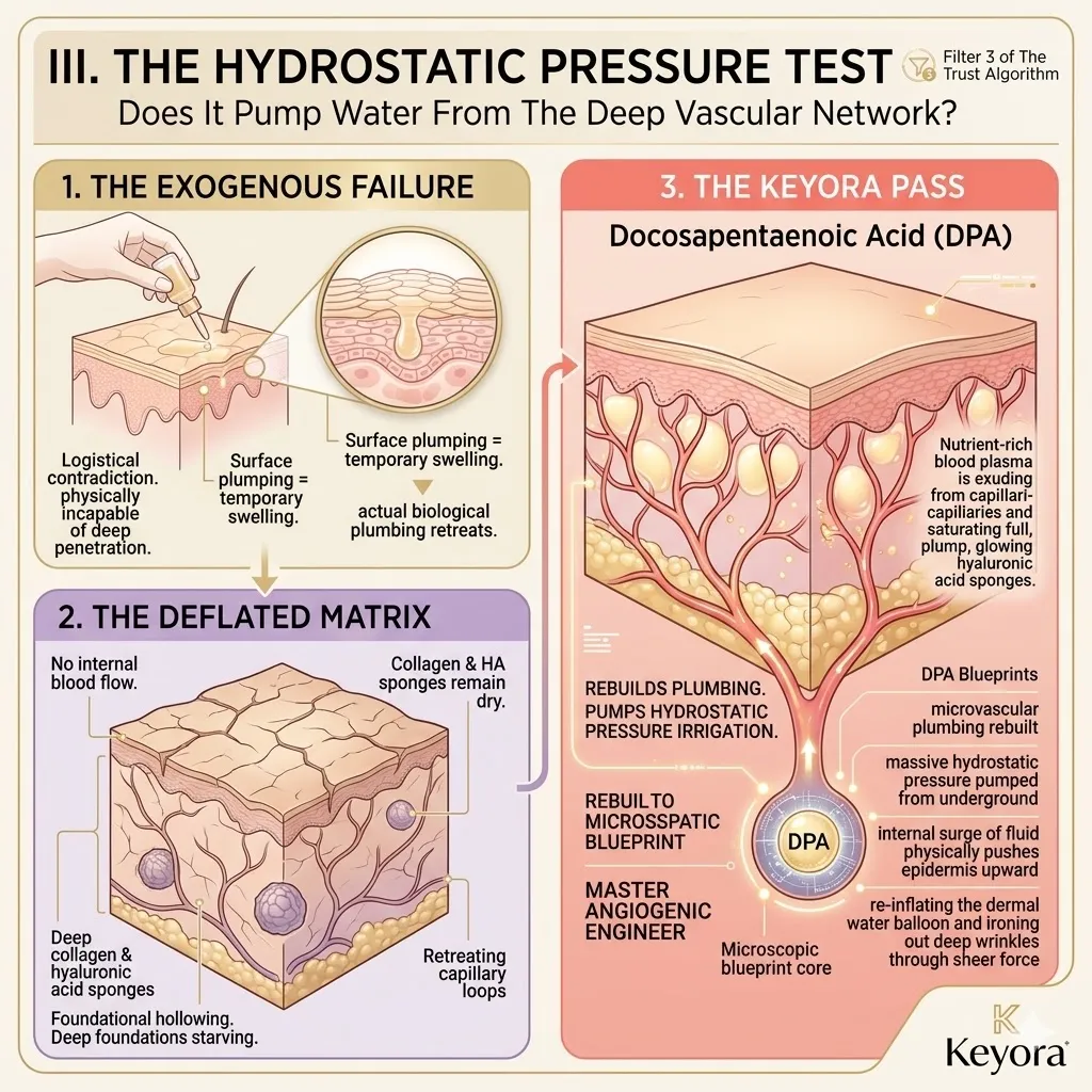 * **Filter 3: The Hydrostatic Pressure Test:** Audits if the product can “Turn on the Faucets.” Surface lotions are physically unable to reach the vascular plumbing.