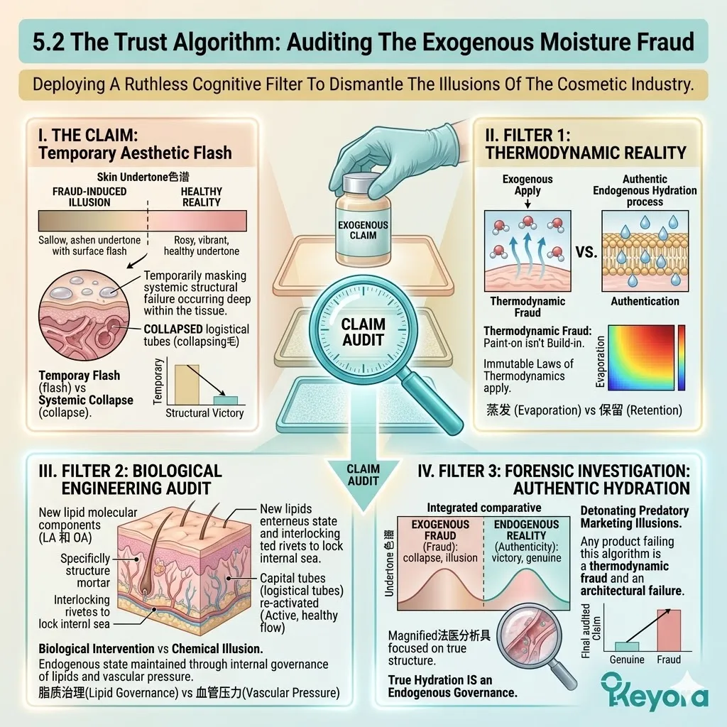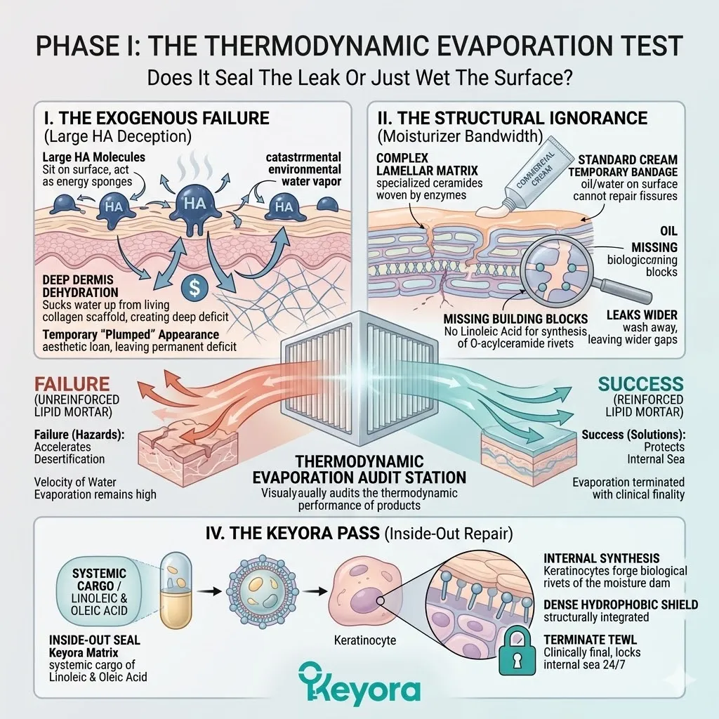 * **Filter 1: The Thermodynamic Evaporation Test:** Audits whether a product creates a permanent seal or causes an “Osmotic Drain” (e.g., topical hyaluronic acid sucking water out of the dermis).