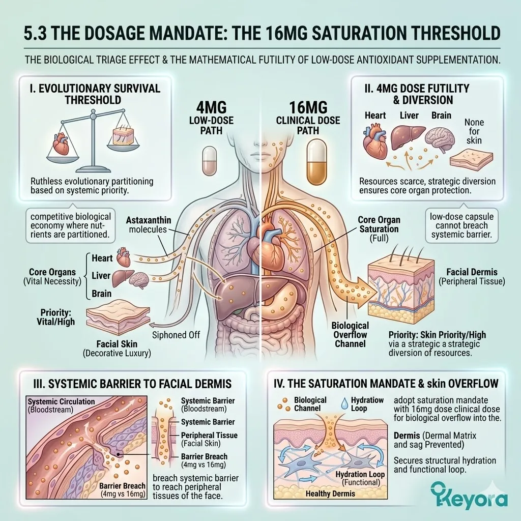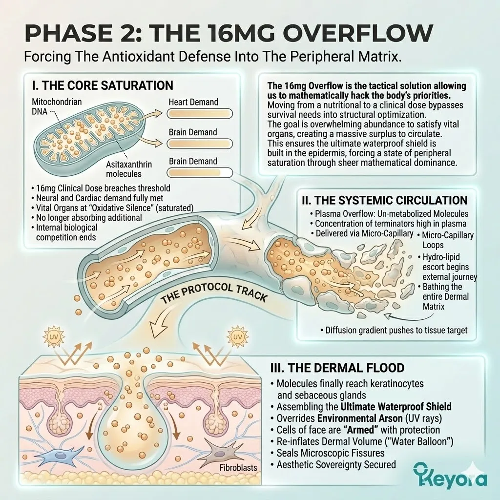 * **The 16mg Saturation Threshold:** A clinical dose designed to overwhelm core organ requirements, forcing a “Biological Overflow” into the peripheral matrix.