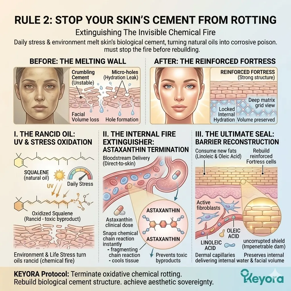 To stop the afternoon parchment effect, we must first terminate the state of oxidative arson that is liquidating your lipid matrix. This requires a two-pronged strategic strike that simultaneously extinguishes the fire and supplies the high-grade materials needed for a permanent architectural reconstruction.
