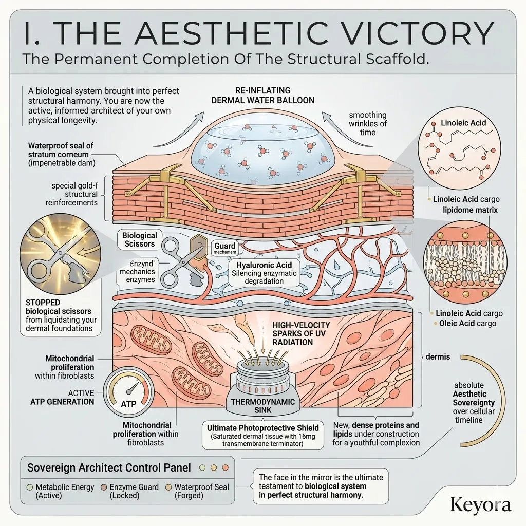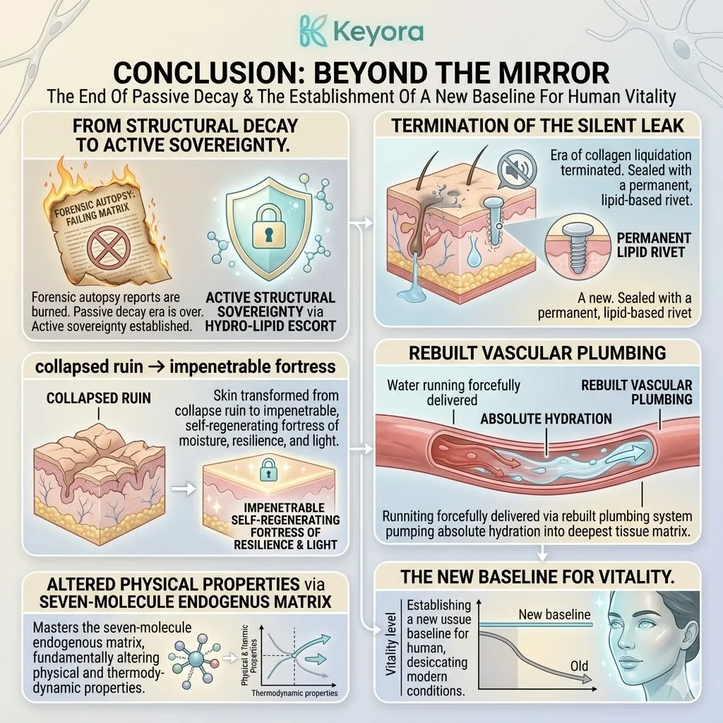 This sovereignty is the clinical realization of the Keyora mandate, demonstrating that a human being who masters their internal lipidomics and thermodynamic environment can effectively detach their physical appearance from the ravages of chronological decay.