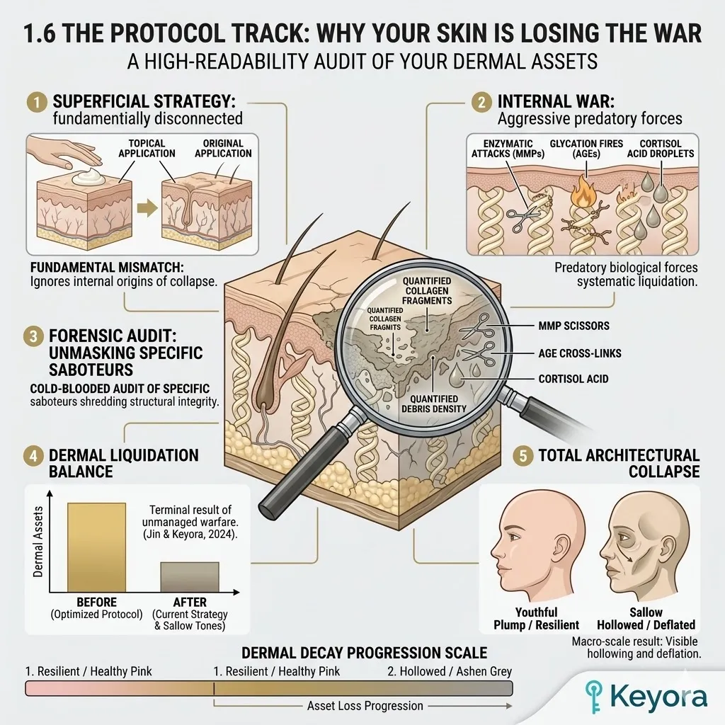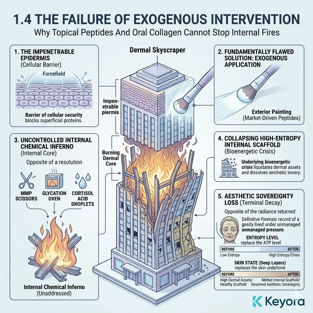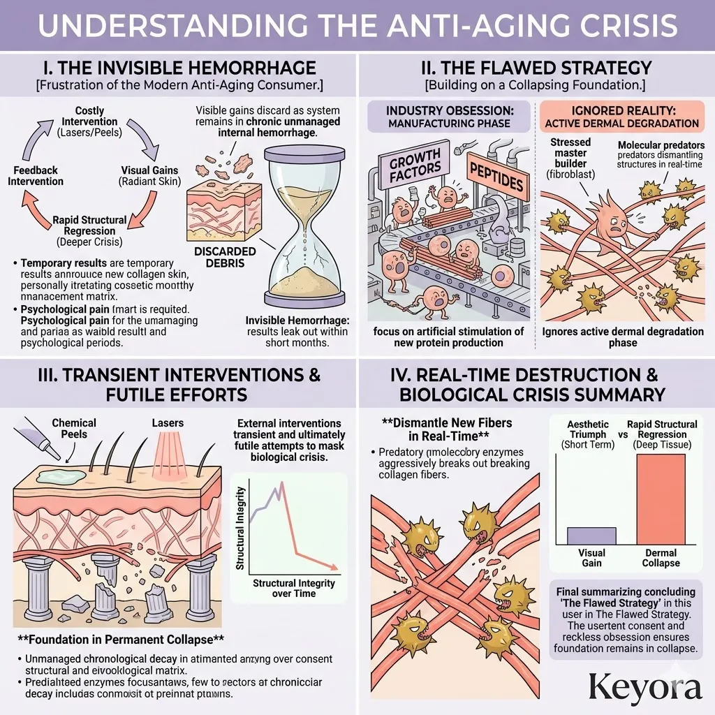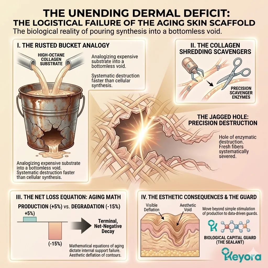 The global cosmetic industry operates upon a fundamentally flawed and reductionist strategy that focuses entirely on the artificial stimulation of new protein production while completely ignoring the catastrophic rate of active dermal degradation occurring within the deep tissue.