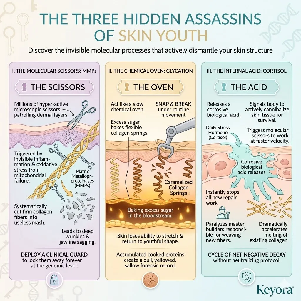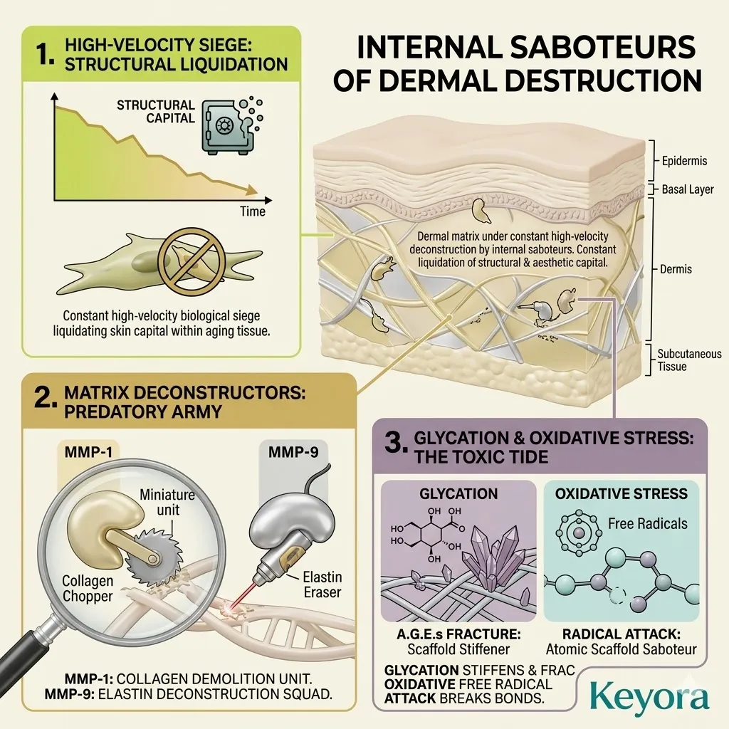 These internal saboteurs function as efficient demolition crews that target and deconstruct the high-value protein scaffolds required for skin density, structural volume, and youthful snap-back tension.