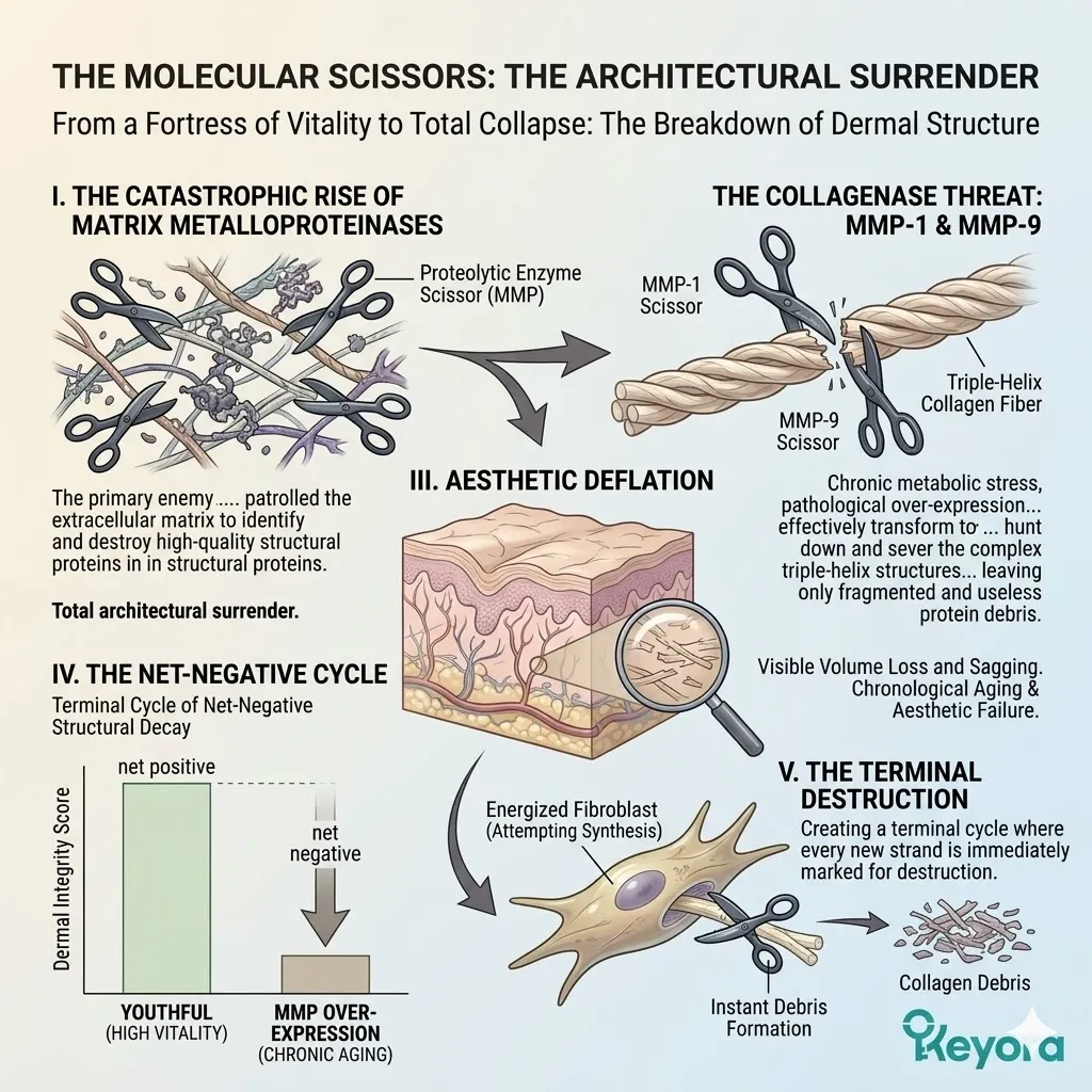 The rise of these enzymes signals a state of total architectural surrender, where the very builders of your skin begin to dismantle the foundations they once worked so hard to establish and maintain over decades of youthful vitality and metabolic health.