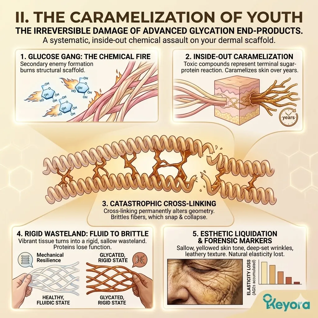 This cross-linking process turns previously flexible and bouncy protein strands into brittle, rigid, and caramelized structures that easily snap and collapse under the mechanical stress of facial movement or environmental pressure.