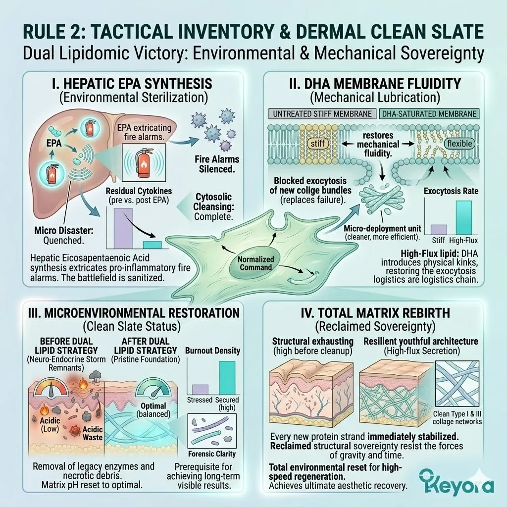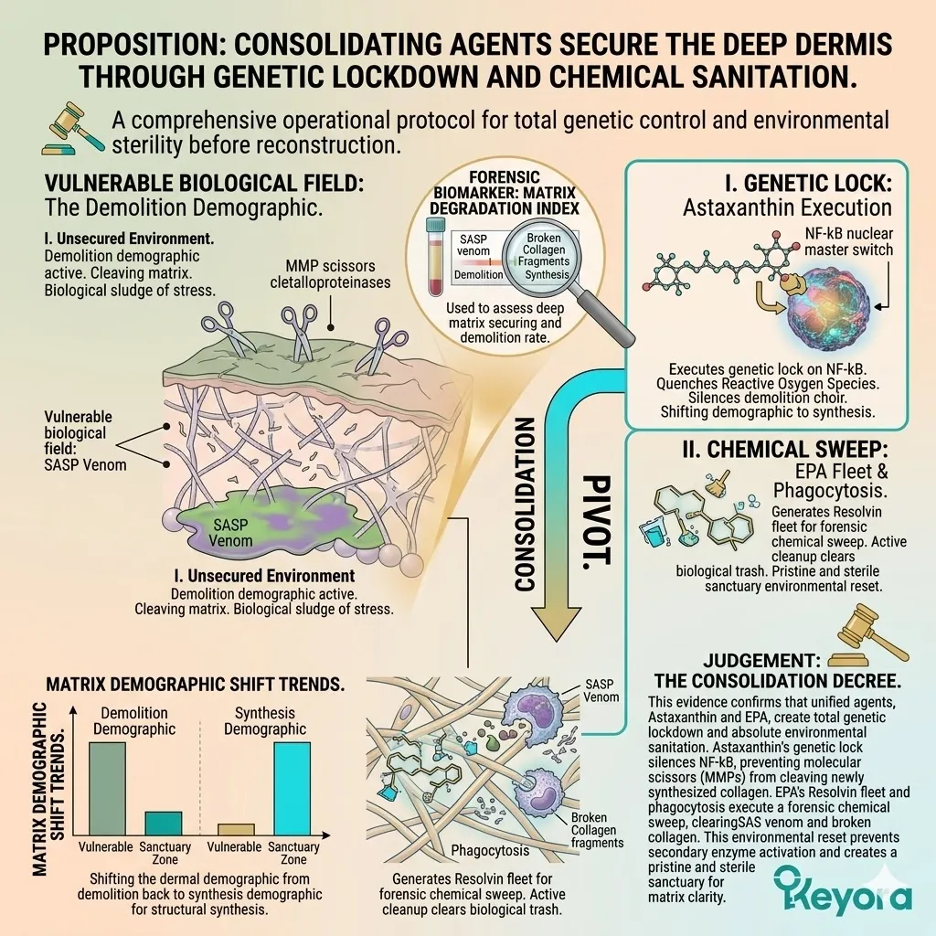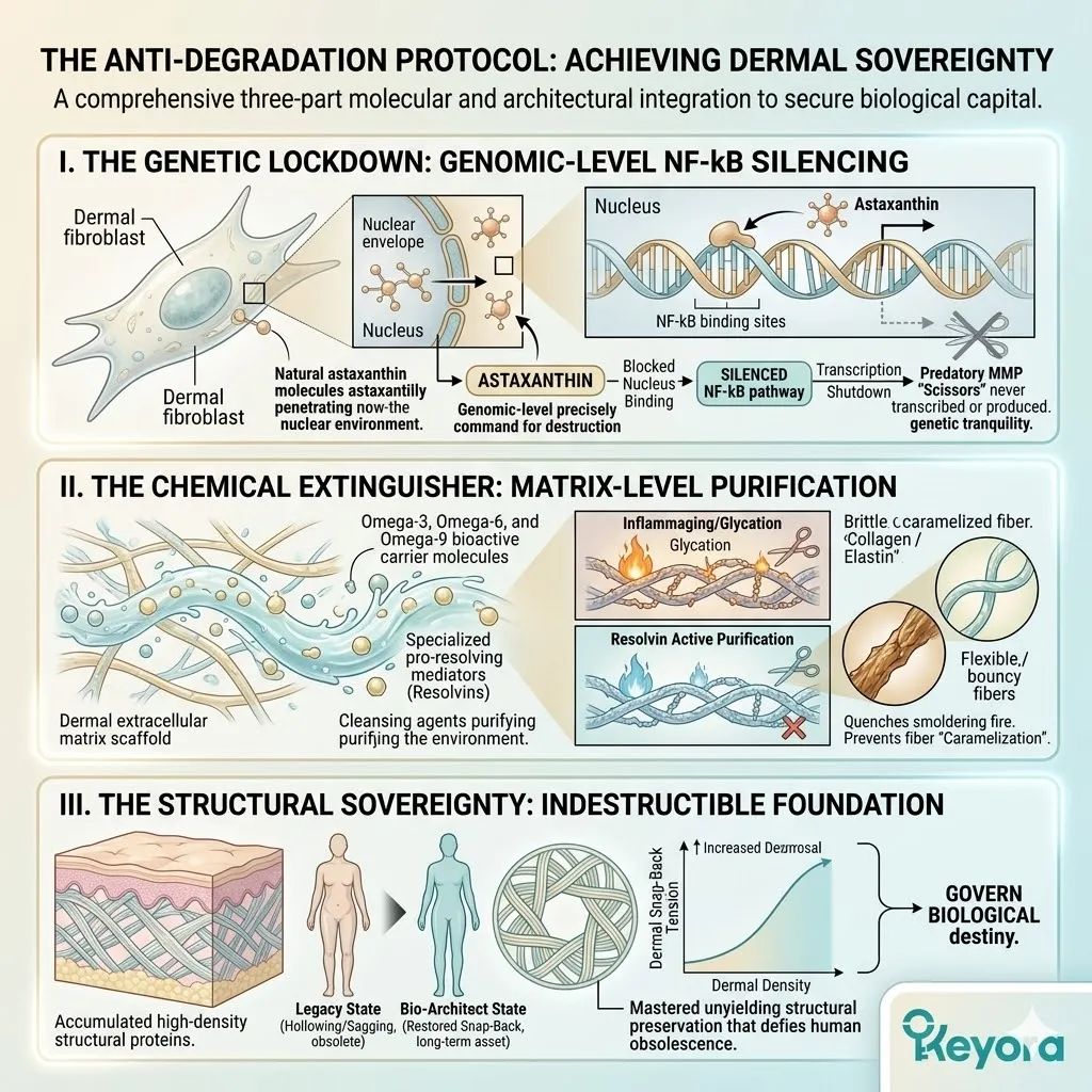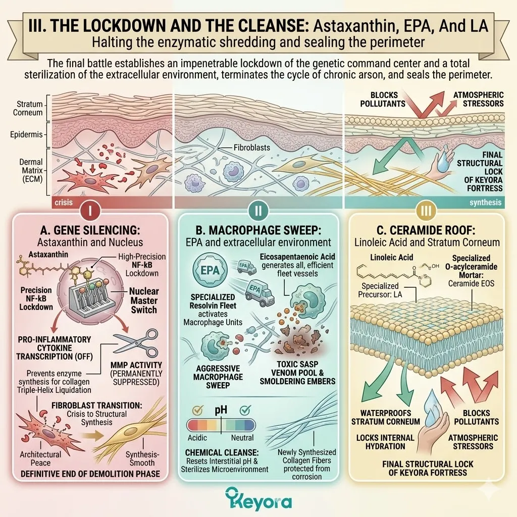 * **The Dermal Lockdown (Astaxanthin + EPA + LA):** Astaxanthin penetrates the nucleus for **Gene Silencing** of NF-kB; EPA facilitates the **Macrophage Sweep** of SASP venom; Linoleic Acid (LA) constructs the **Ceramide Roof** to stop moisture evaporation.