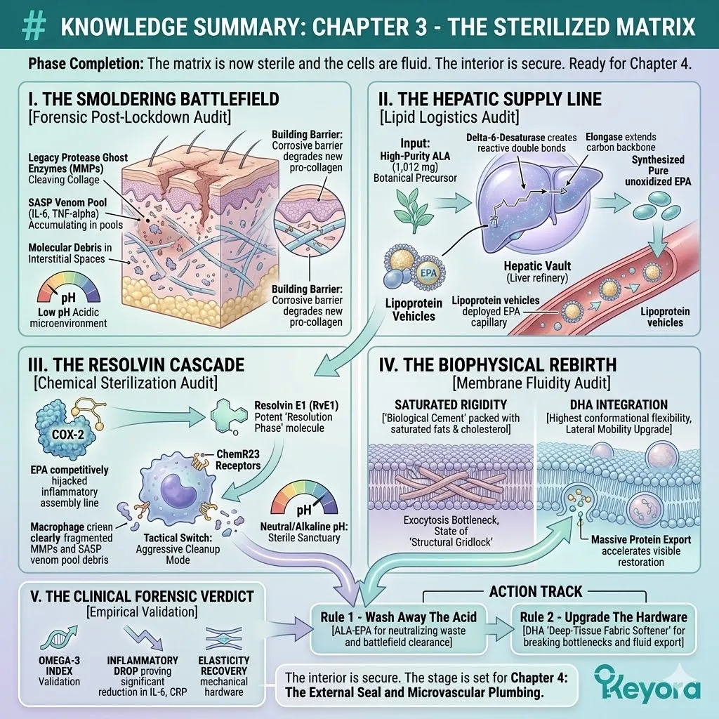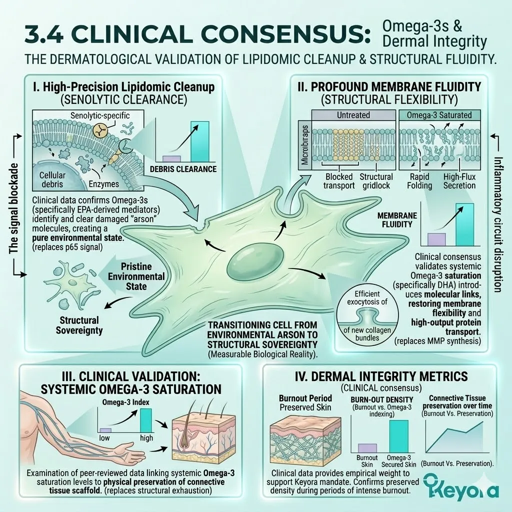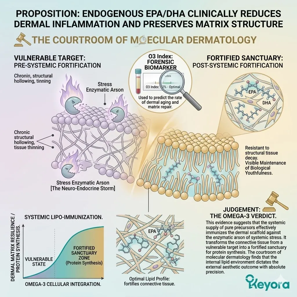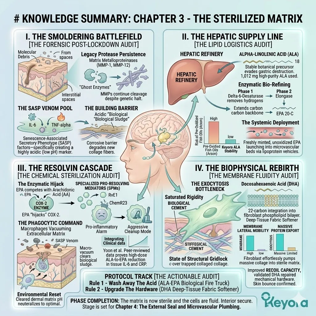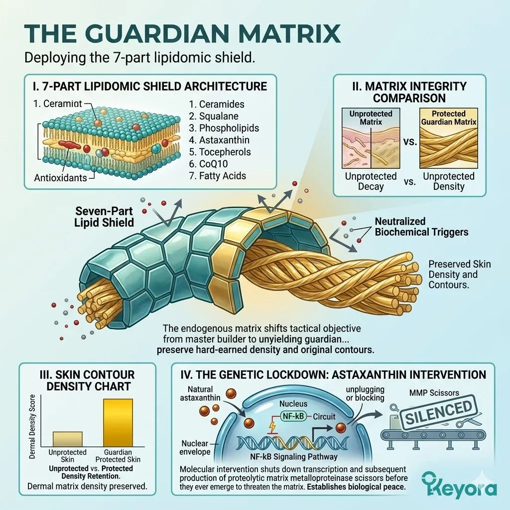 * **The Dermal Lockdown (Astaxanthin + EPA + LA):** Astaxanthin penetrates the nucleus for **Gene Silencing** of NF-kB; EPA facilitates the **Macrophage Sweep** of SASP venom; Linoleic Acid (LA) constructs the **Ceramide Roof** to stop moisture evaporation.