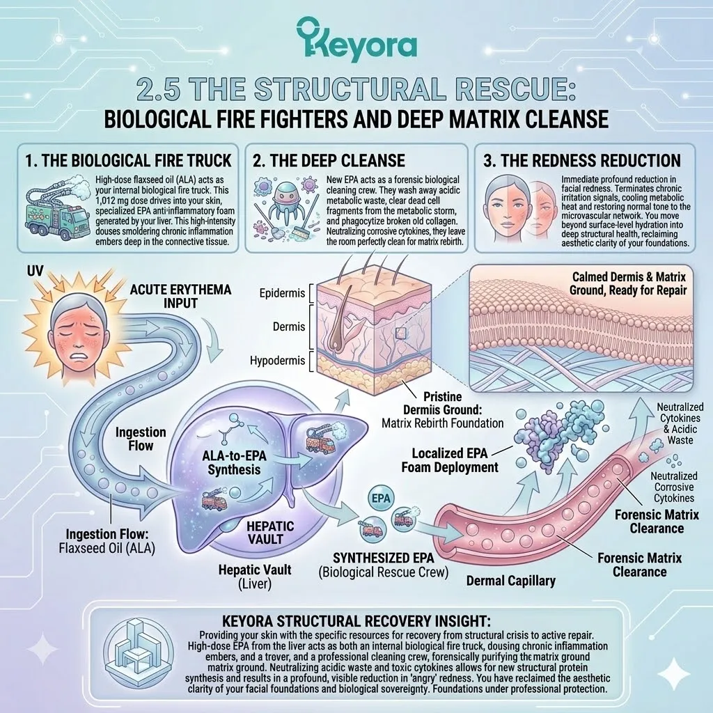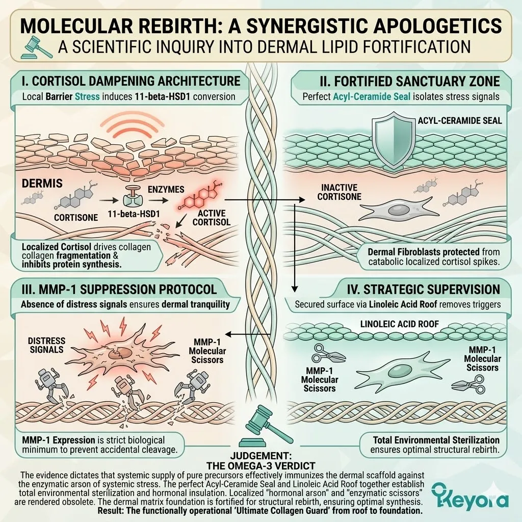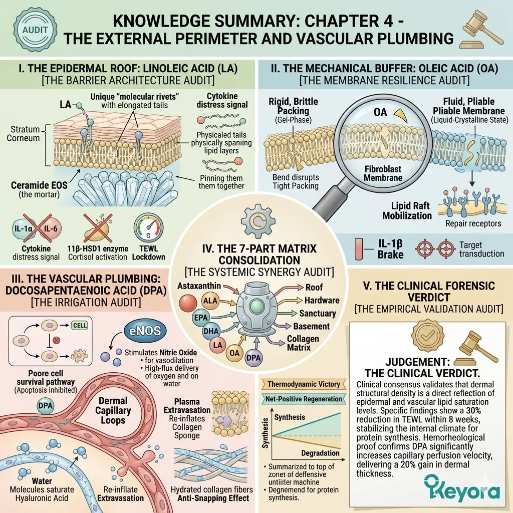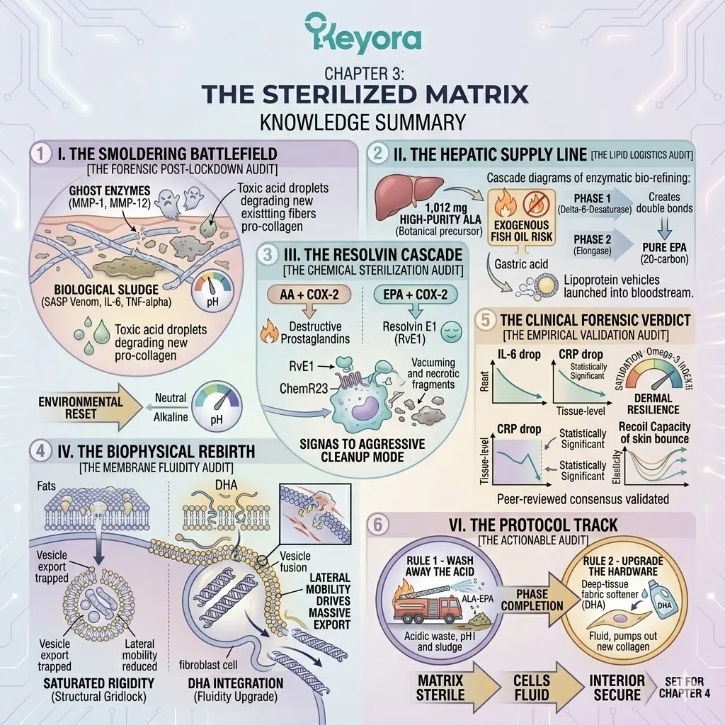 * **The Dermal Lockdown (Astaxanthin + EPA + LA):** Astaxanthin penetrates the nucleus for **Gene Silencing** of NF-kB; EPA facilitates the **Macrophage Sweep** of SASP venom; Linoleic Acid (LA) constructs the **Ceramide Roof** to stop moisture evaporation.