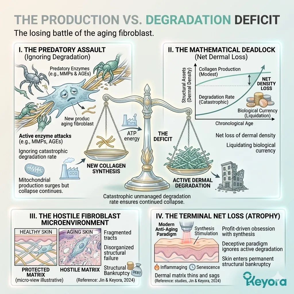 The aging fibroblast functions as a master builder trapped within a hostile and corrosive microenvironment where the predatory enzymes destroy the foundational structural components and extracellular scaffolds faster than the cellular machinery can possibly execute the high-energy labor of repair, reconstruction, and architectural maintenance.