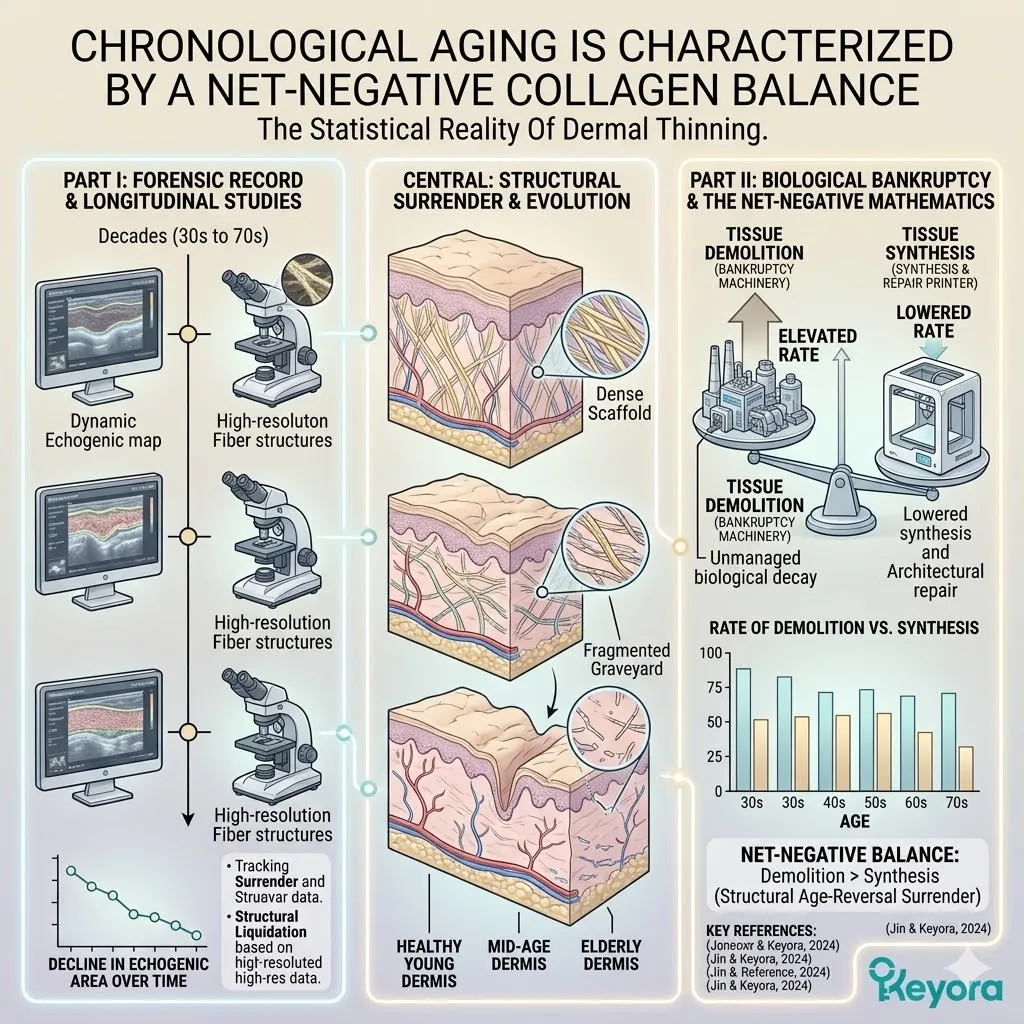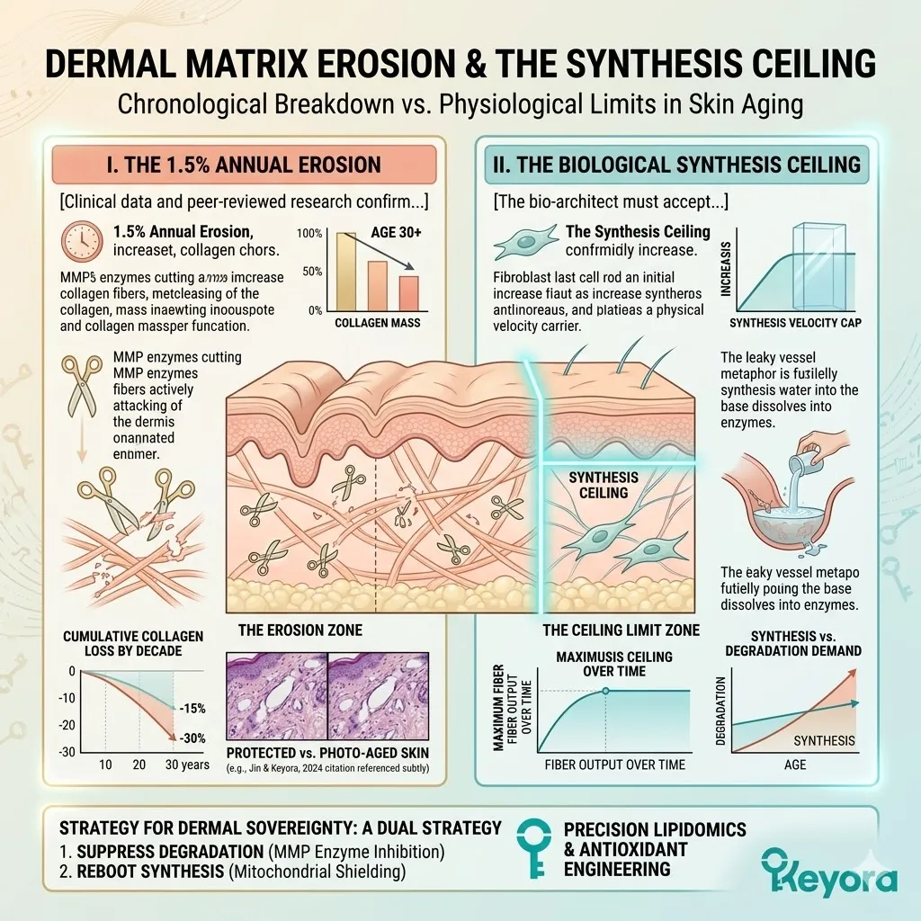 If your cellular production rate of new collagen fibers rests at a generous five percent but your internal degradation rate remains unmanaged at a staggering fifteen percent, your dermal matrix exists in a state of terminal, net-negative decay.