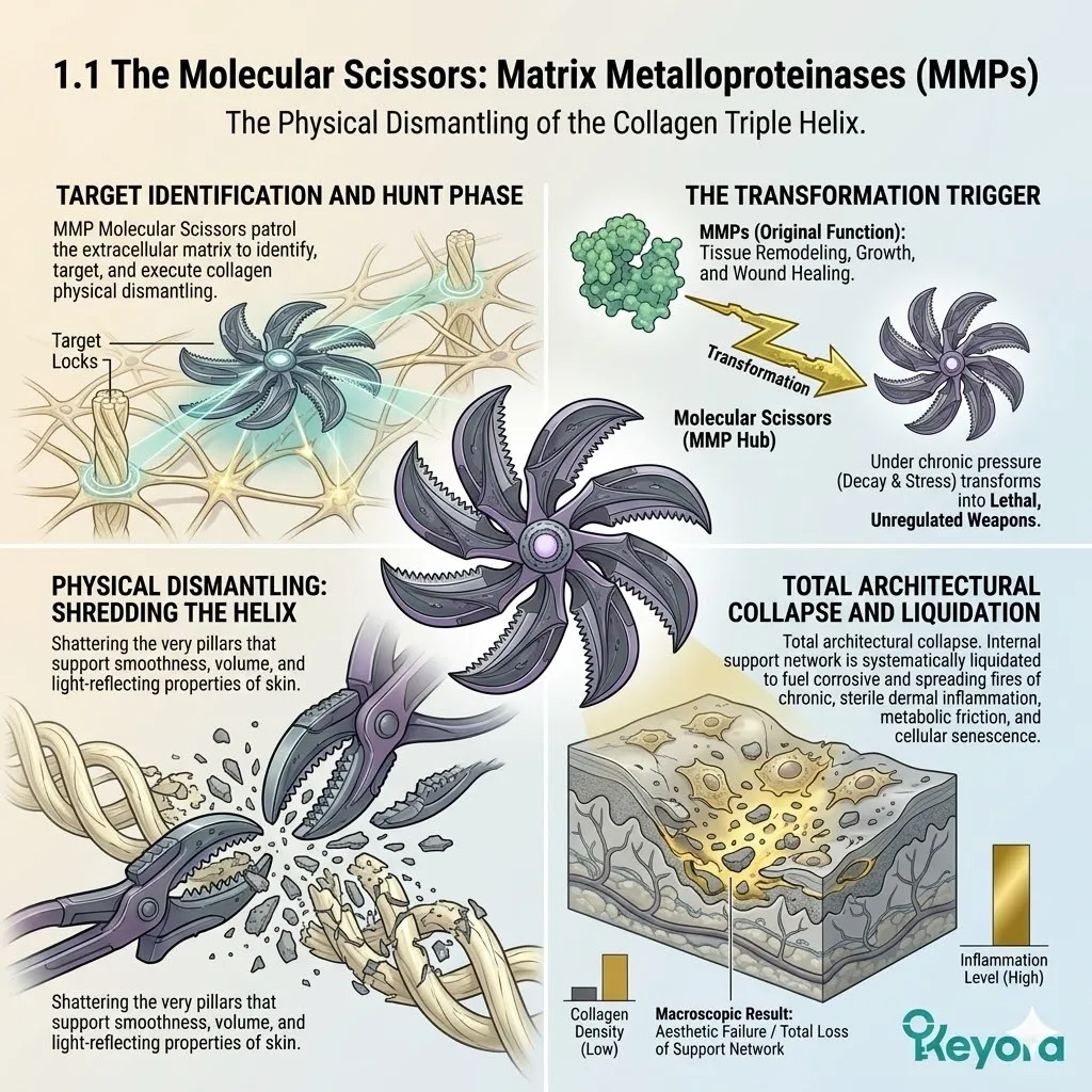 These biological catalysts do not represent abstract scientific concepts but function as literal, physical cutting tools that patrol the extracellular matrix to identify and destroy high-quality structural proteins with devastating precision.