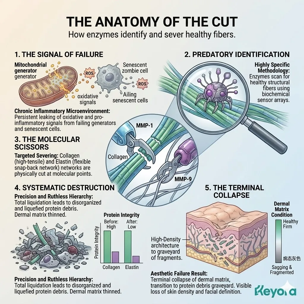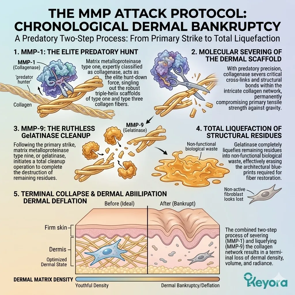 These predatory enzymes hunt down and sever the complex triple-helix structures of youthful, resilient collagen fibers, leaving only fragmented and useless protein debris in their wake across the entire dermal landscape.