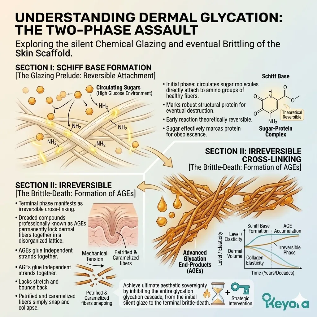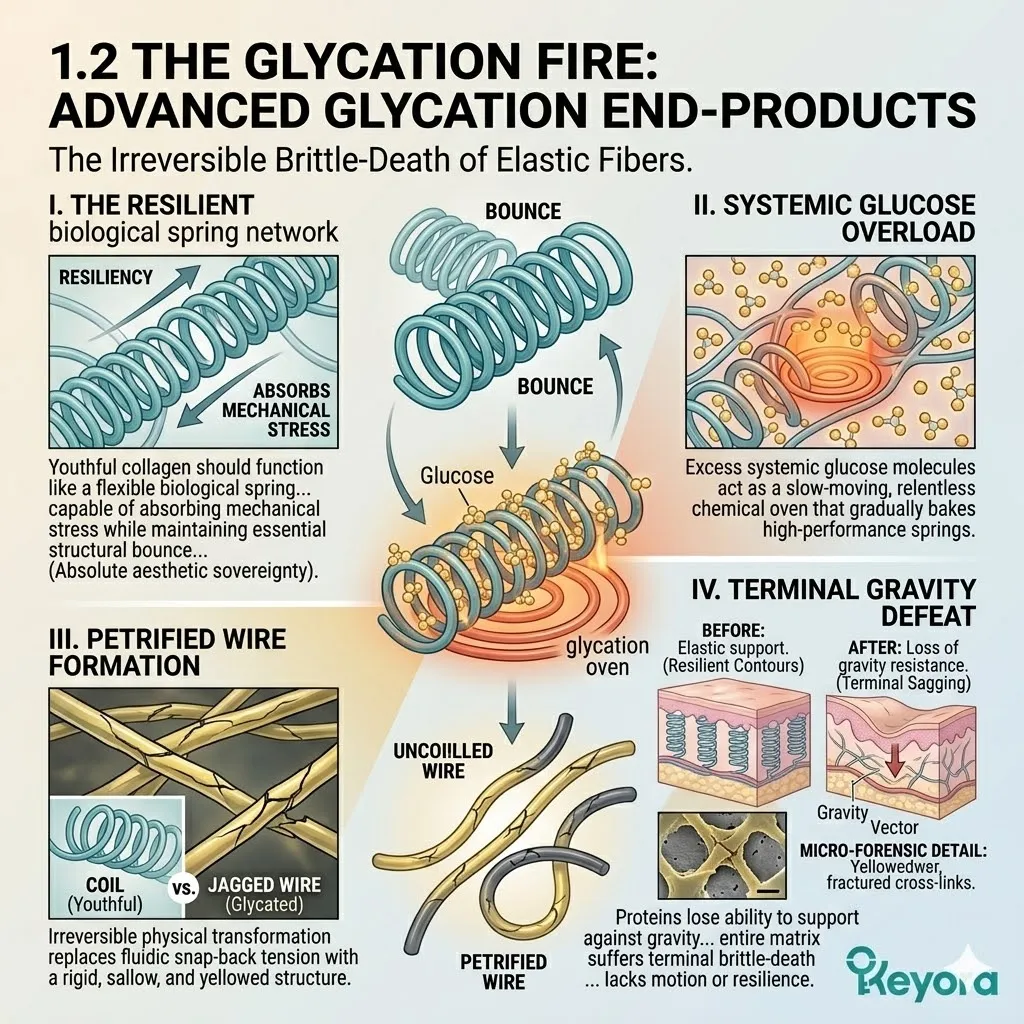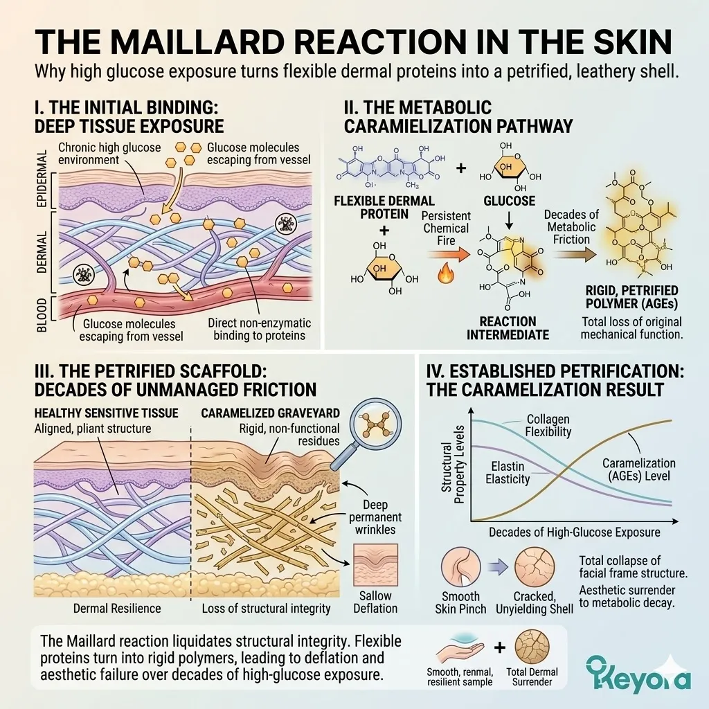 Excess glucose molecules within the systemic circulation bind to your once-pliant collagen and elastin fibers, initiating a catastrophic chemical process known as cross-linking that permanently alters the geometry of your dermal support network.