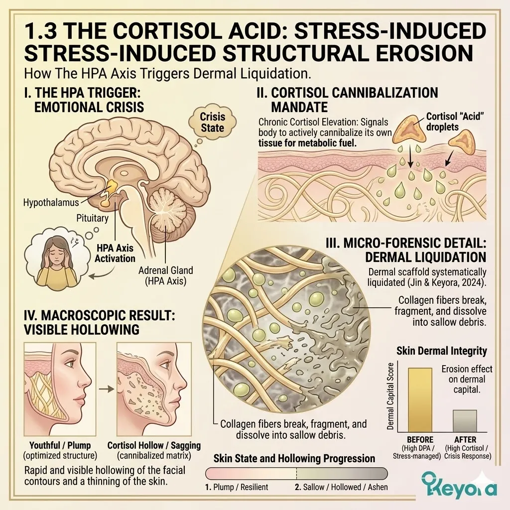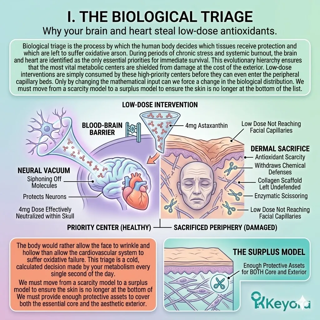* **The Biological Triage Effect:** The body prioritizes the heart and brain over the skin during oxidative stress; the dermis is categorized as a **Non-Vital Peripheral Organ** and strategically abandoned when resources are scarce.