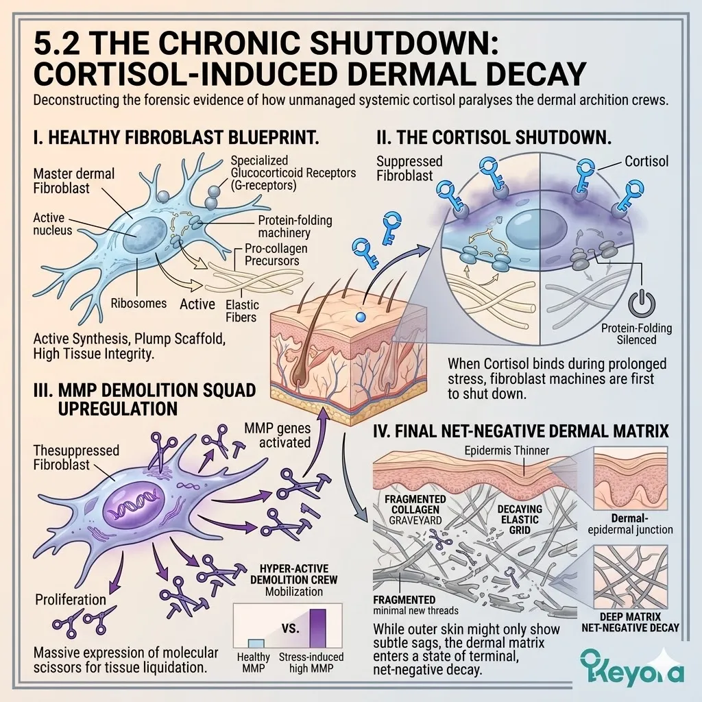 This hunt ensures that every new strand of collagen synthesized by your energized fibroblasts is immediately marked for destruction, creating a terminal cycle of net-negative structural decay that defines the forensic reality of chronological aging and aesthetic failure.