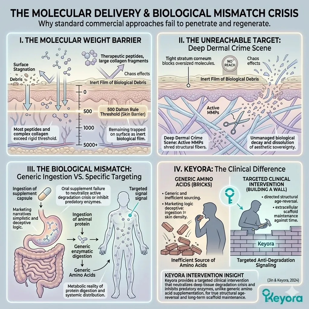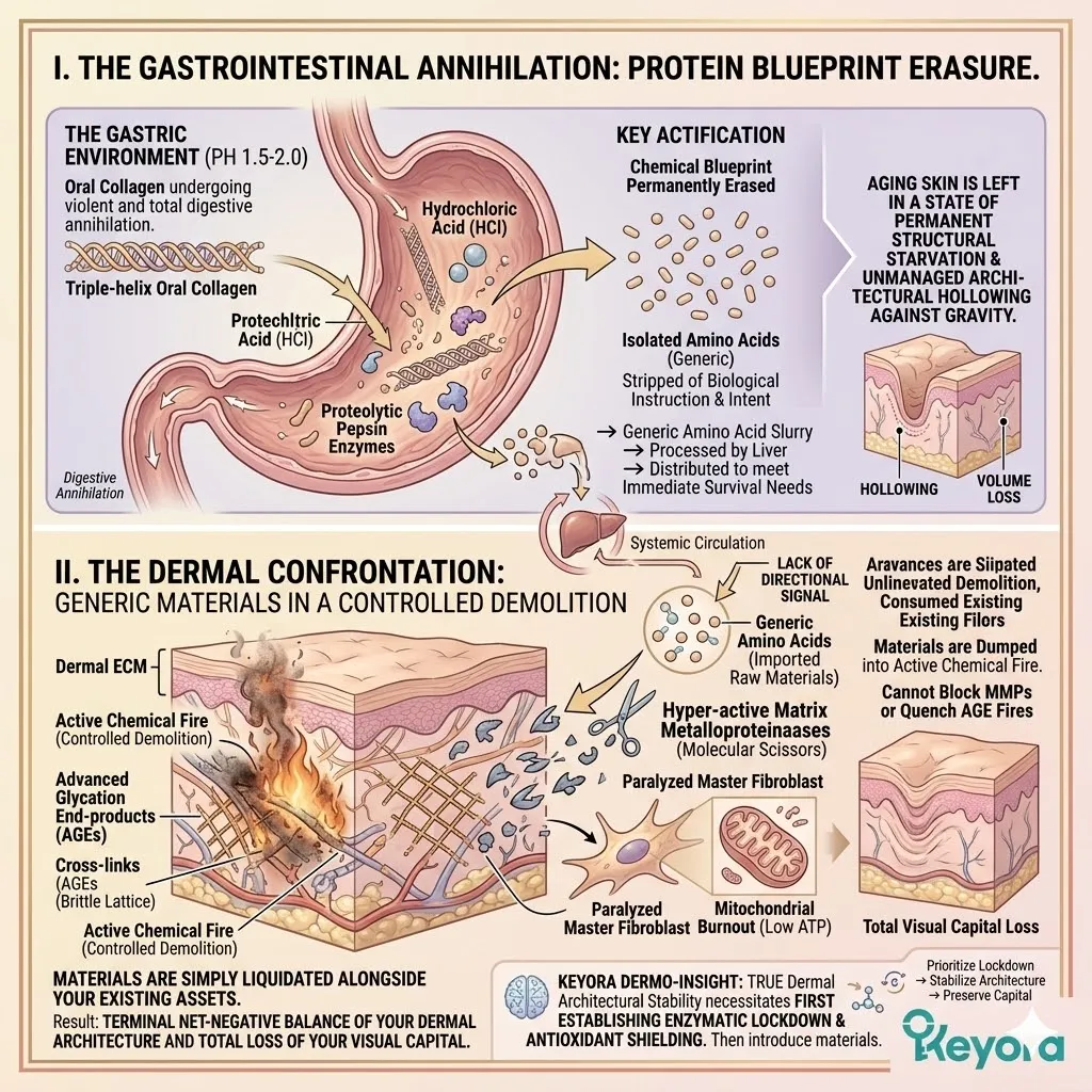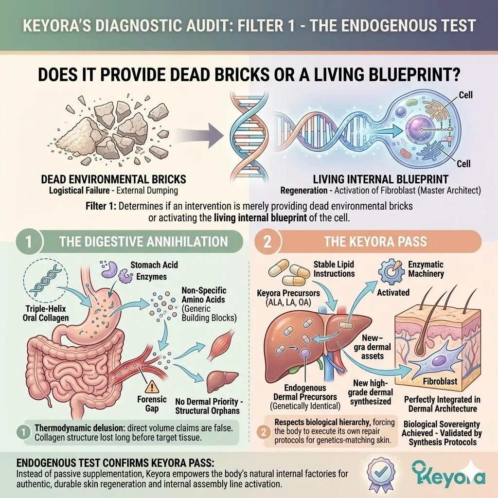 * **Filter 1 (The Endogenous Test):** Exposes the **Collagen Fallacy**; oral collagen peptides suffer from **Digestive Annihilation**, where stomach acids pulverize the triple-helix into non-specific, useless amino acids.