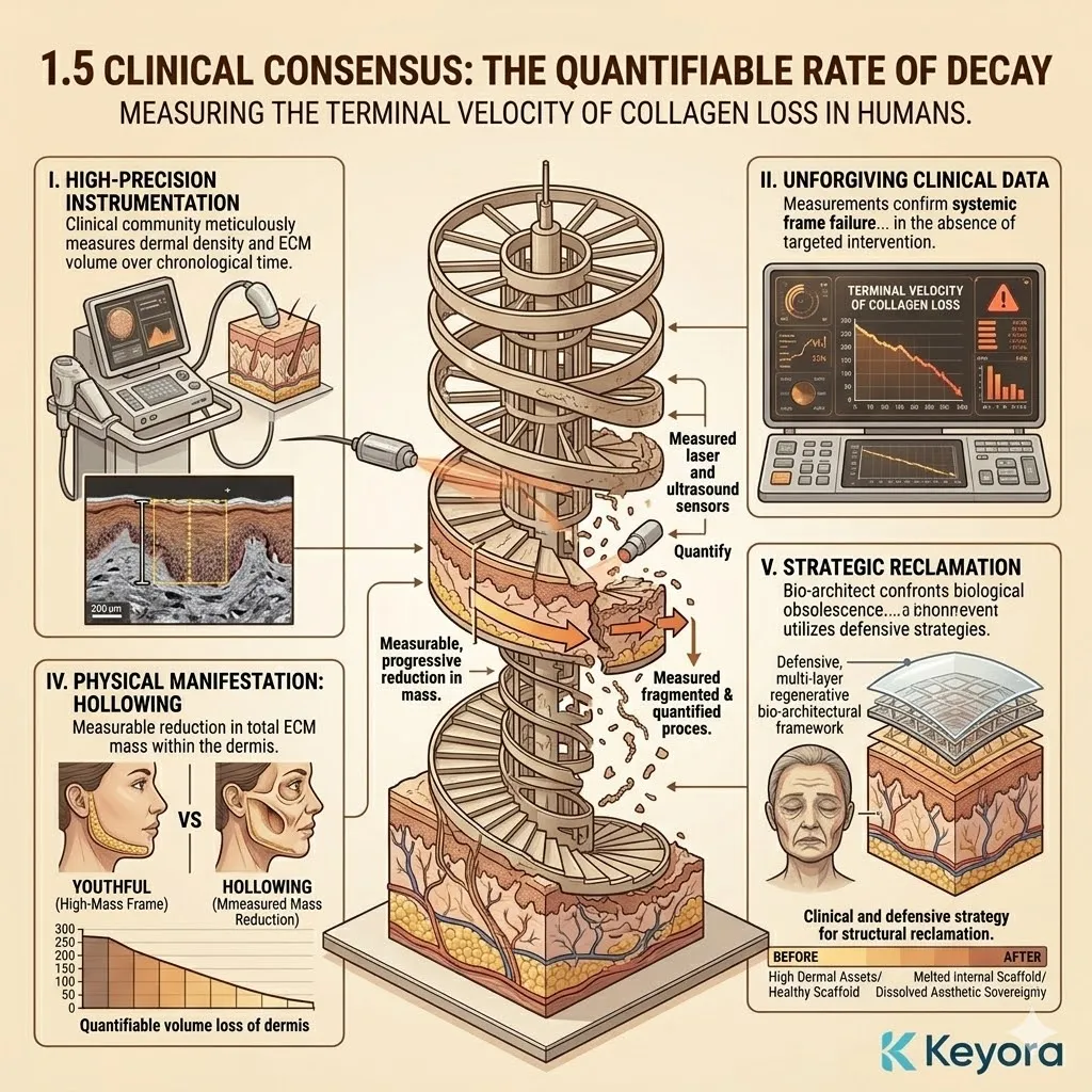 Clinical data and peer-reviewed research confirm the chilling reality that upon reaching the age of thirty, the human dermal matrix initiates a permanent and irreversible phase of structural erosion characterized by the loss of at least one point five percent of its total collagen mass every single year without exception.