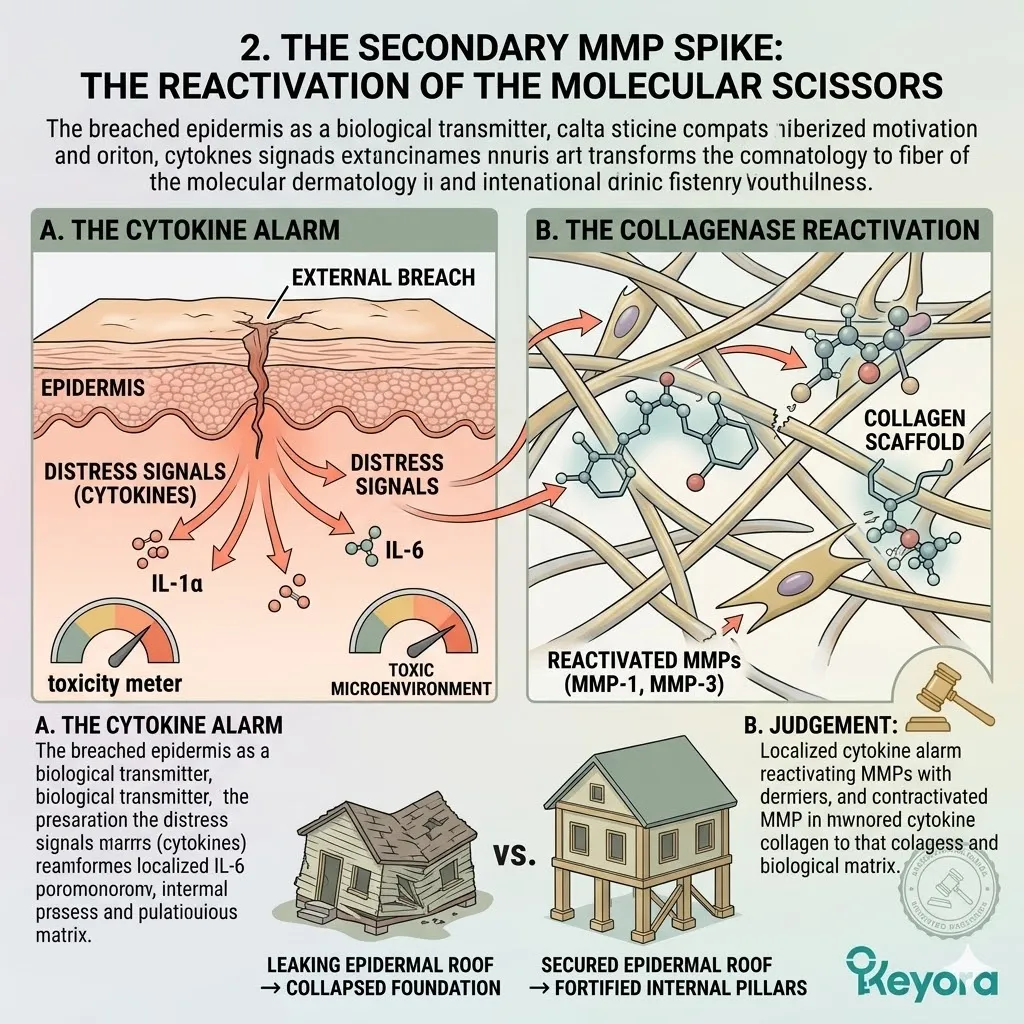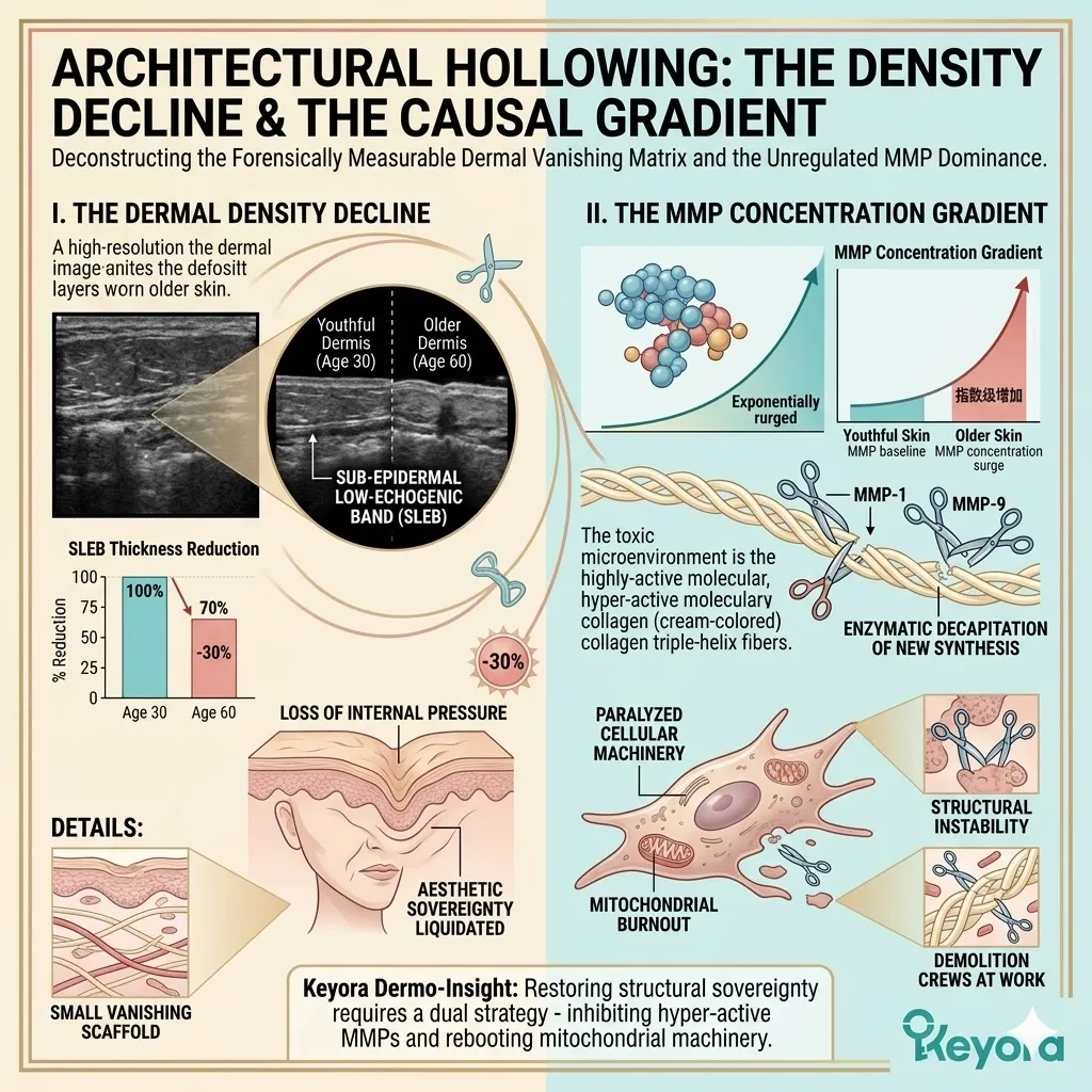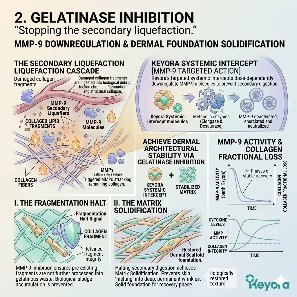 Chronic metabolic stress and residual micro-inflammation trigger the pathological over-expression of specific enzymes known as MMP-1 and MMP-9, which effectively transform your healthy skin into a site of permanent structural hollowing.