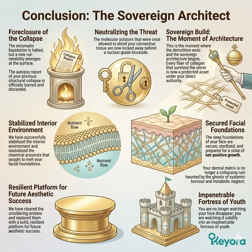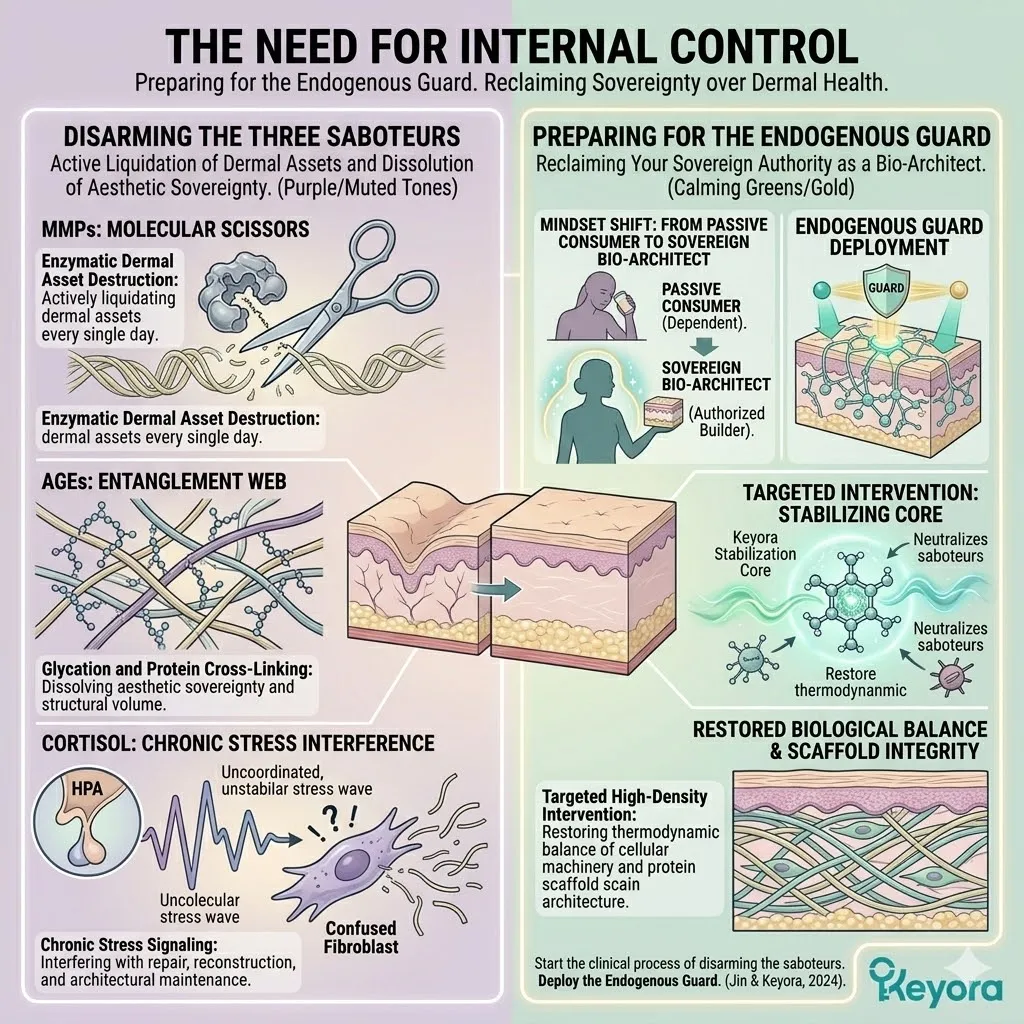 Without a clinical and defensive intervention to stabilize the internal environment and neutralize the predatory enzymes, the skin enters a state of permanent structural bankruptcy where the essential assets are harvested by the architects of decay to fuel the corrosive and spreading fires of chronic inflammaging and cellular senescence.