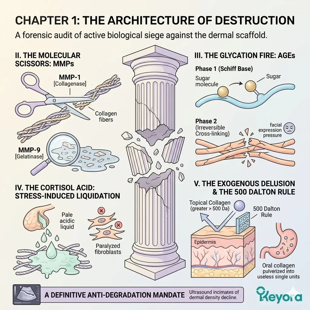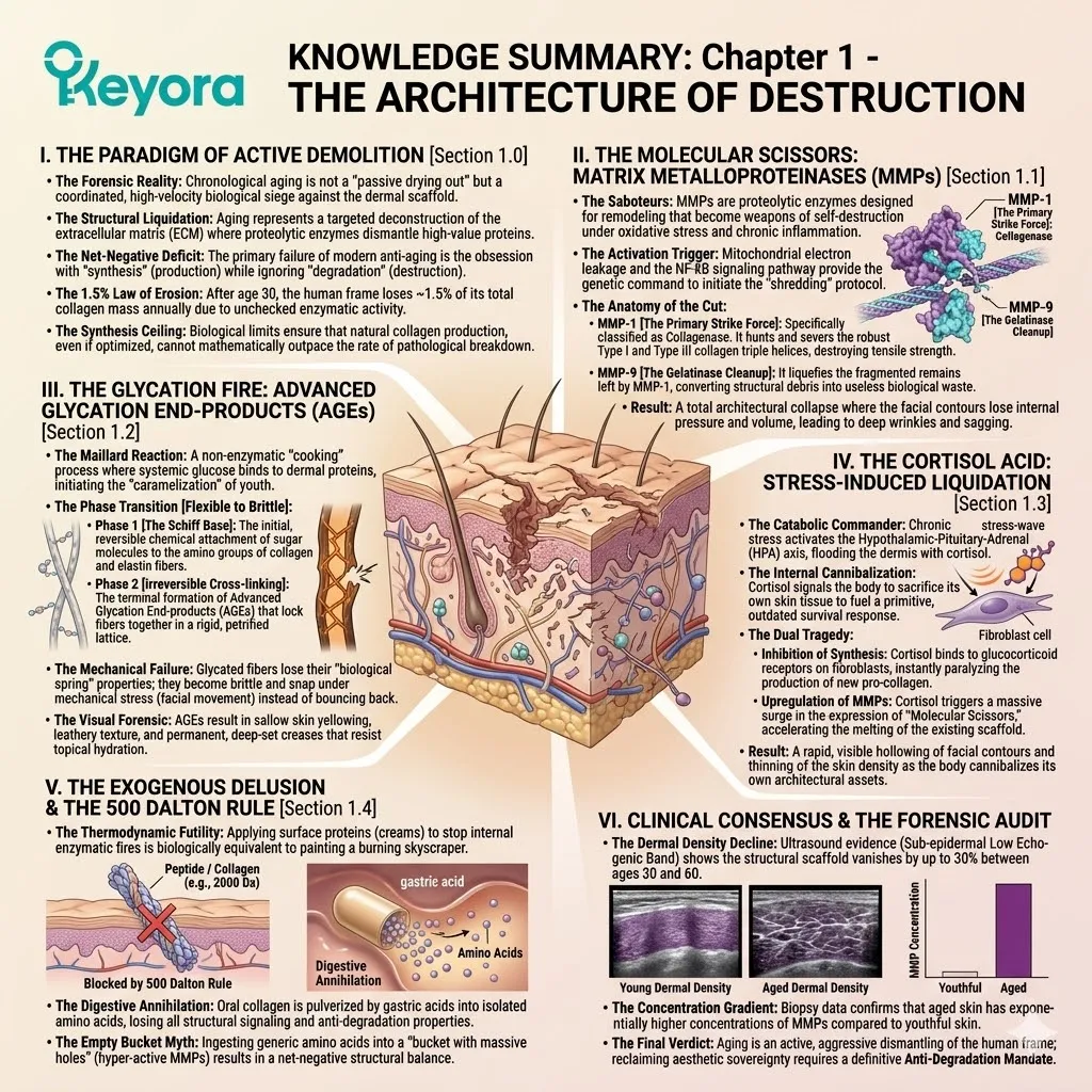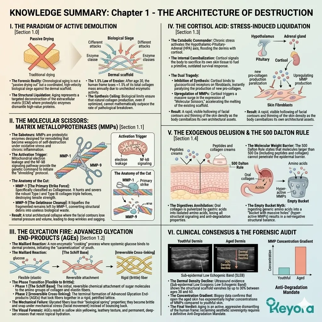 The structural collapse of your facial architecture does not occur by accident or through the passive passage of chronological time alone. It represents an active, aggressive biological dismantling process orchestrated by a specific army of predatory enzymes and toxic chemical reactions lurking deep within the dermal matrix layers of the human face.