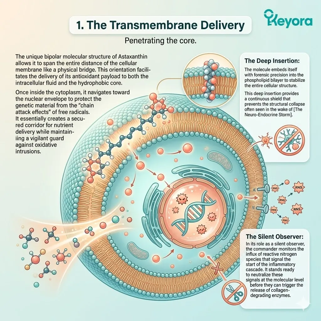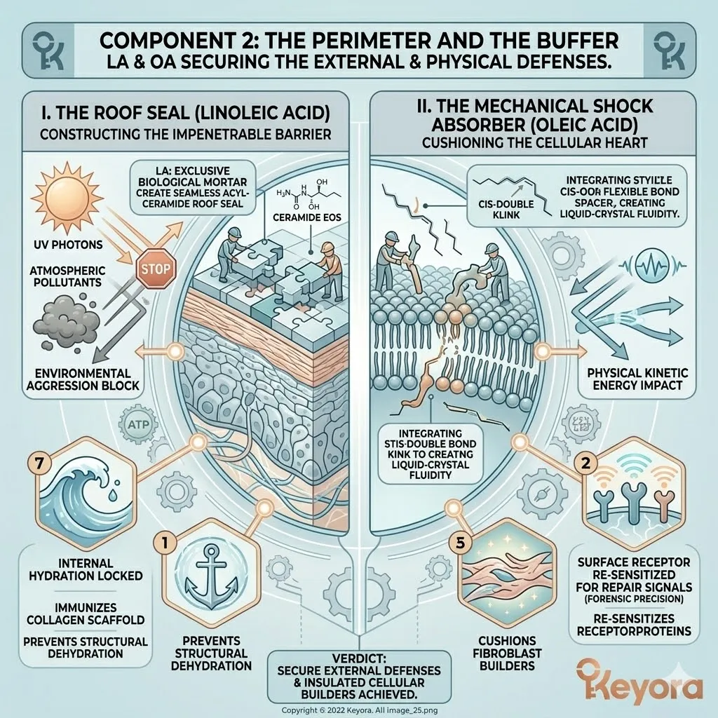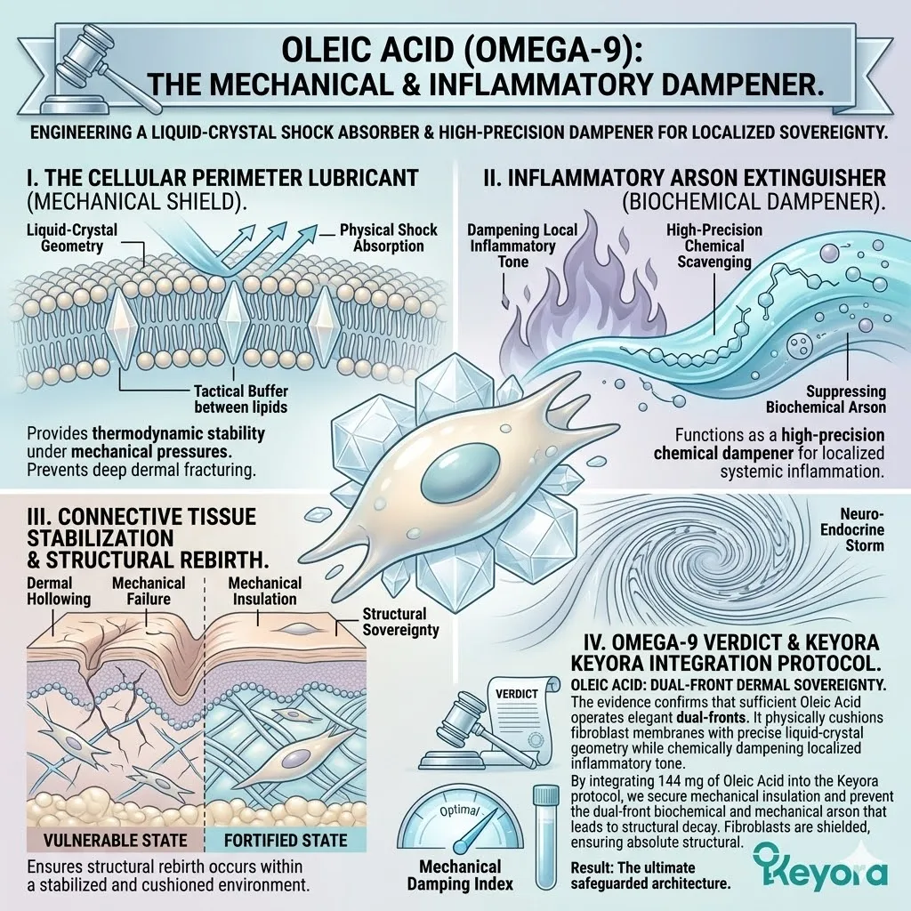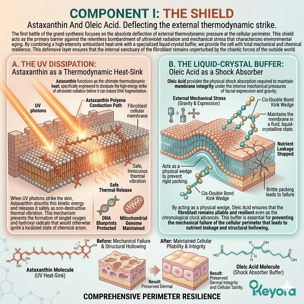 * **The External Shield (Astaxanthin + Oleic Acid):** Astaxanthin acts as a **Thermodynamic Heat-Sink** to dissipate UV energy, while Oleic Acid acts as a **Liquid-Crystal Buffer** to absorb mechanical stress and maintain membrane pliability.