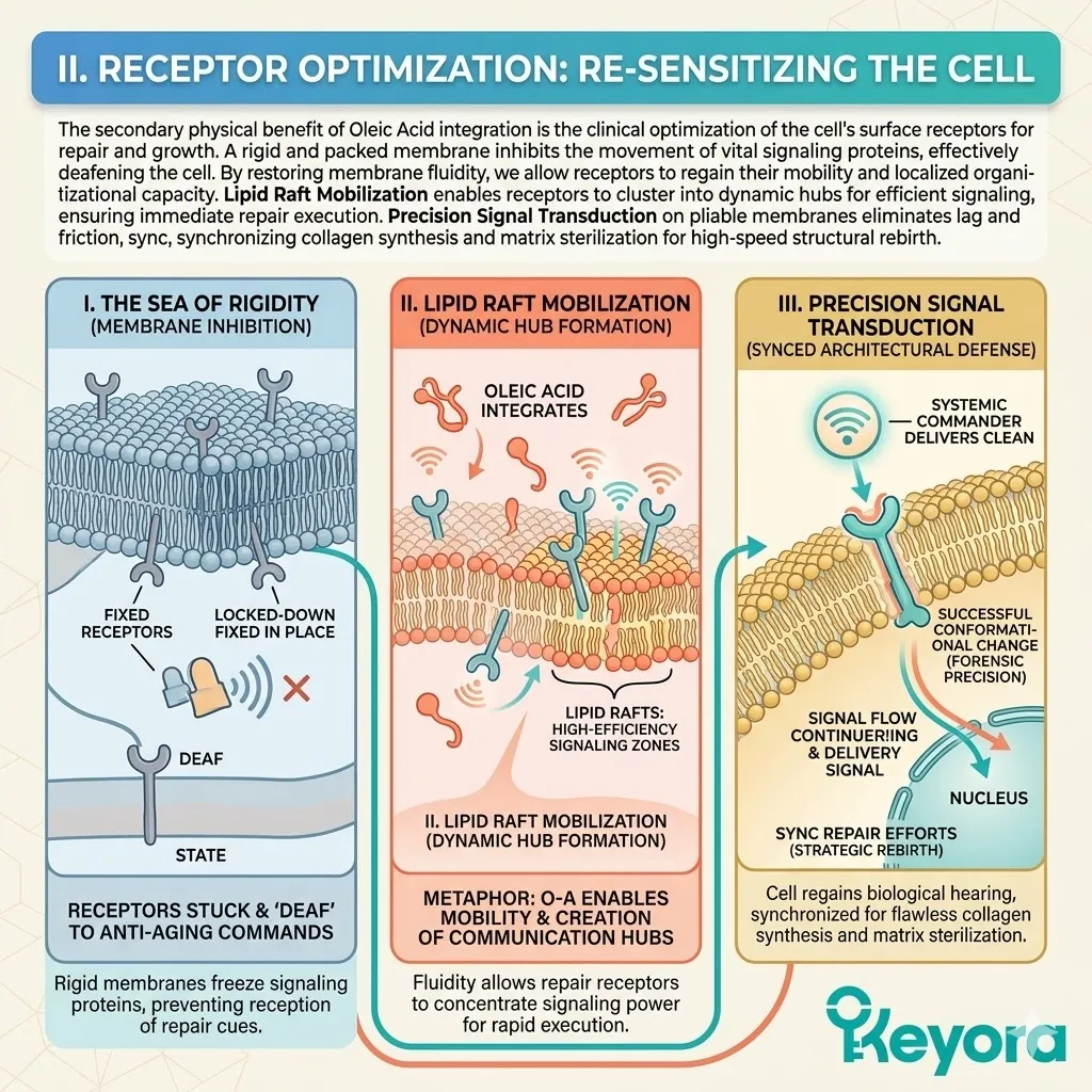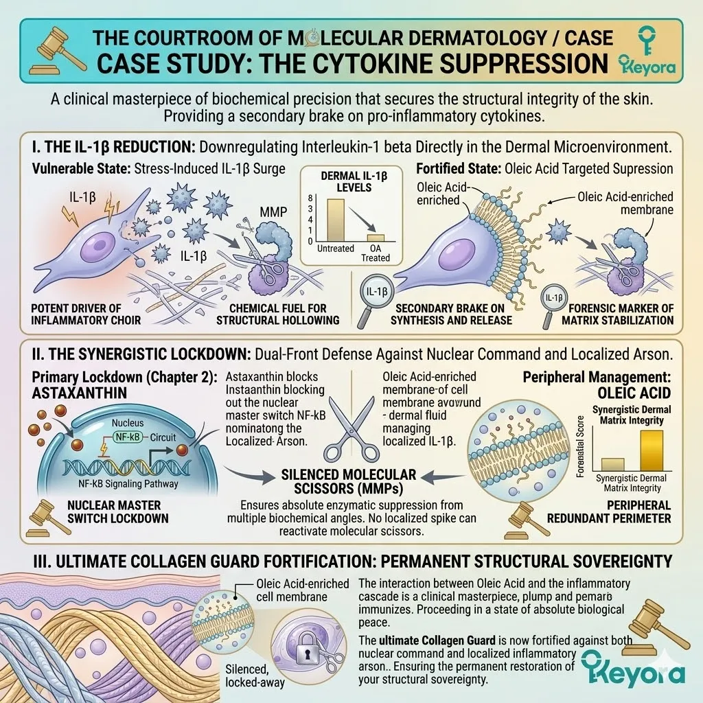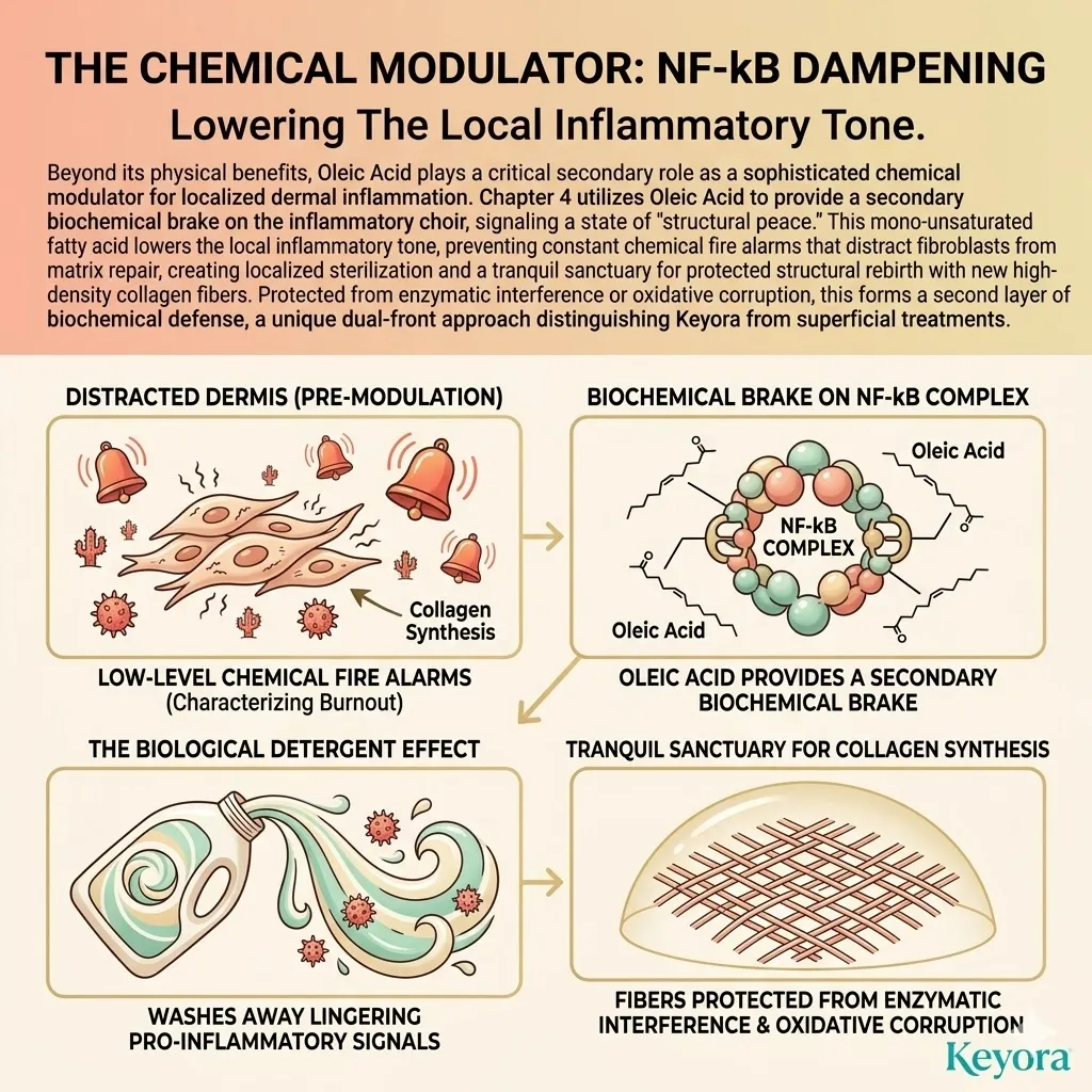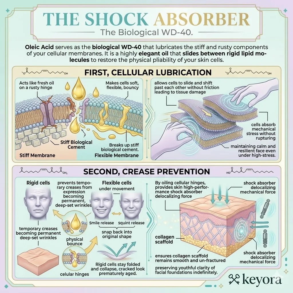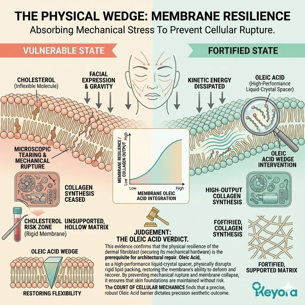 * **The External Shield (Astaxanthin + Oleic Acid):** Astaxanthin acts as a **Thermodynamic Heat-Sink** to dissipate UV energy, while Oleic Acid acts as a **Liquid-Crystal Buffer** to absorb mechanical stress and maintain membrane pliability.