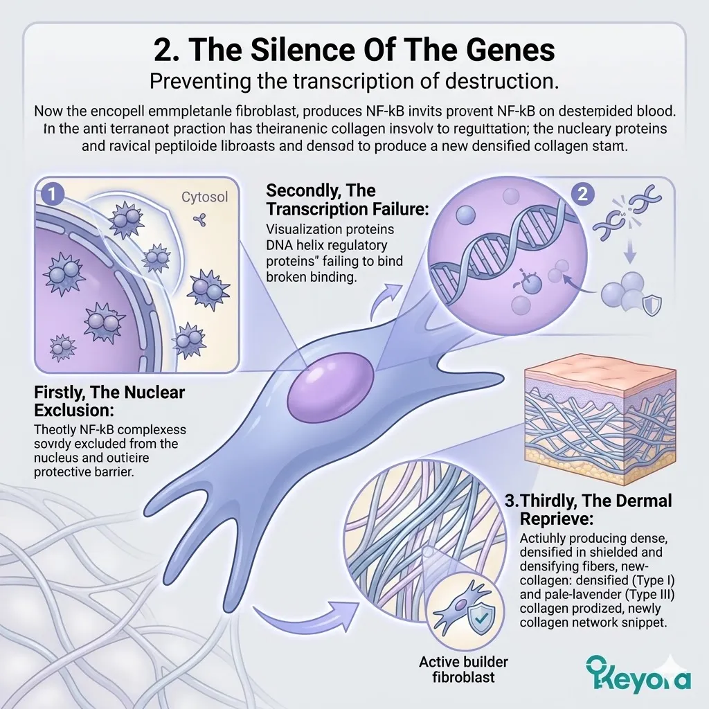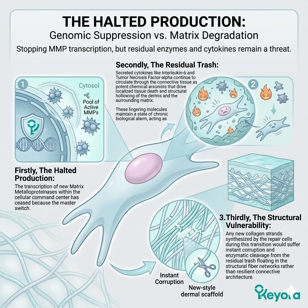 By intercepting the command for destruction within the nucleus itself, we establish a permanent state of biological peace that protects the extracellular matrix from the enzymatic demolition crews that characterize the state of chronological and environmental decay.