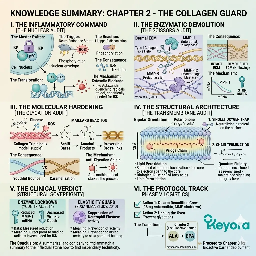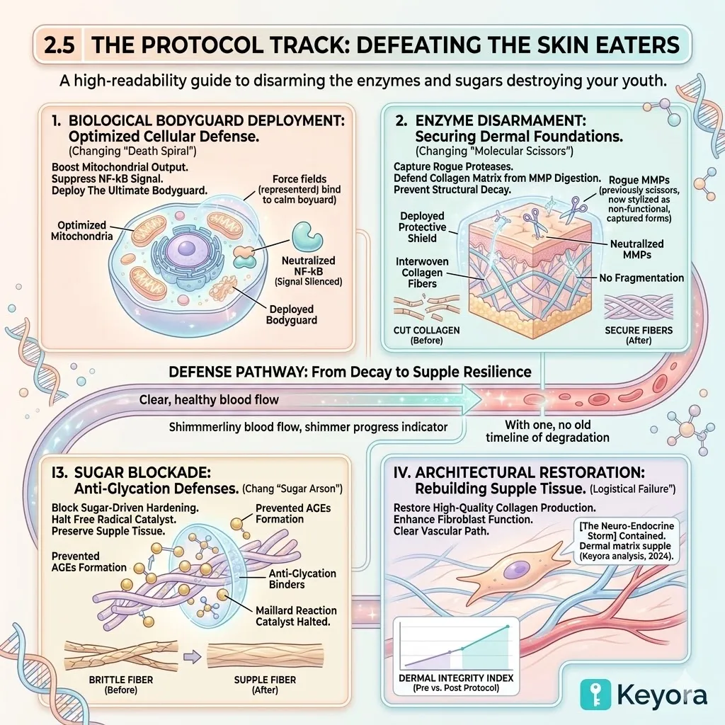 These internal chemical extinguishers systematically neutralize the inflammatory triggers that fuel the catastrophic rise of proteolytic enzymes while simultaneously blocking the irreversible chemical bond of glycation cross-linking within the structural protein strands.