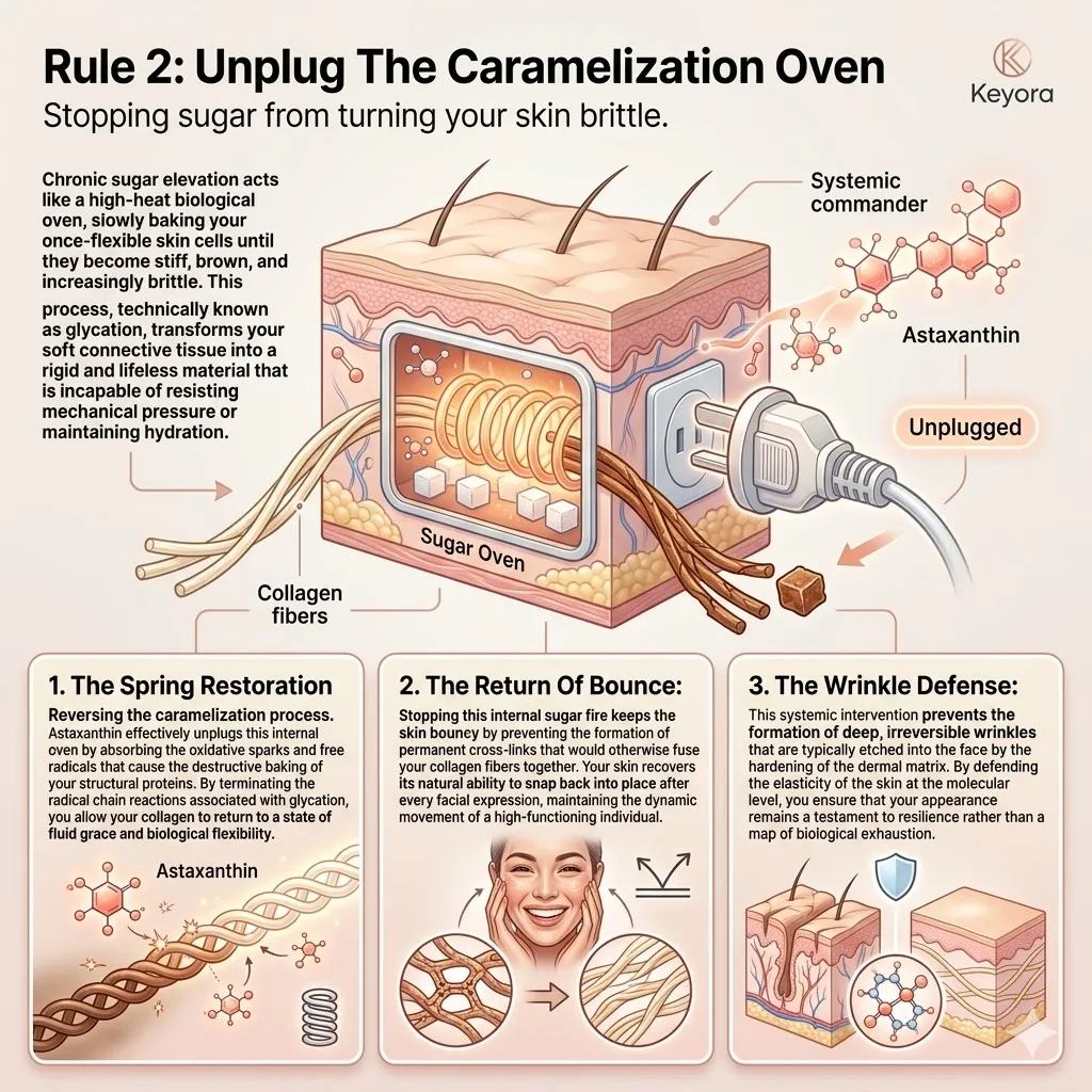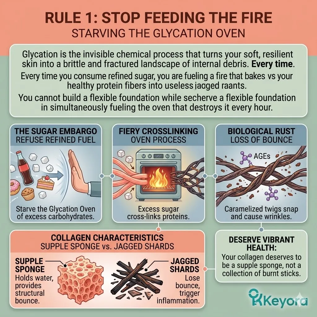 * **Rule 1 (The Sugar Embargo):** Excess refined sugar fuels the **Glycation Oven**, baking soft collagen into brittle, **Caramelized Twigs (AGEs)** that snap and cause permanent deep-set wrinkles.
