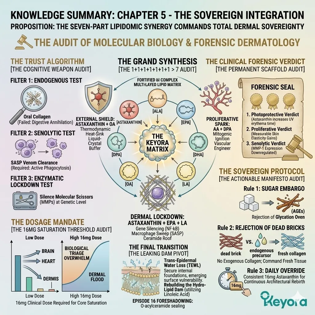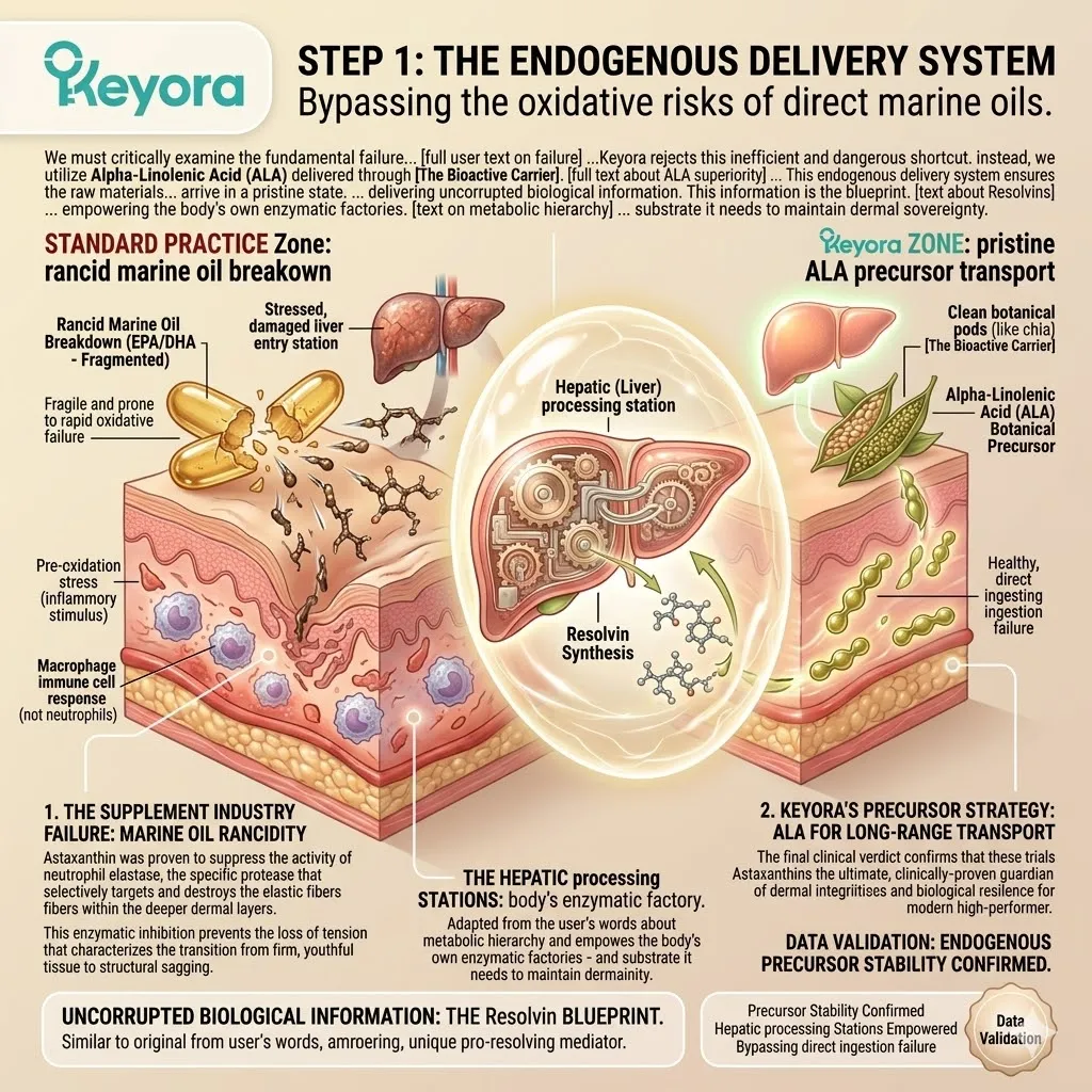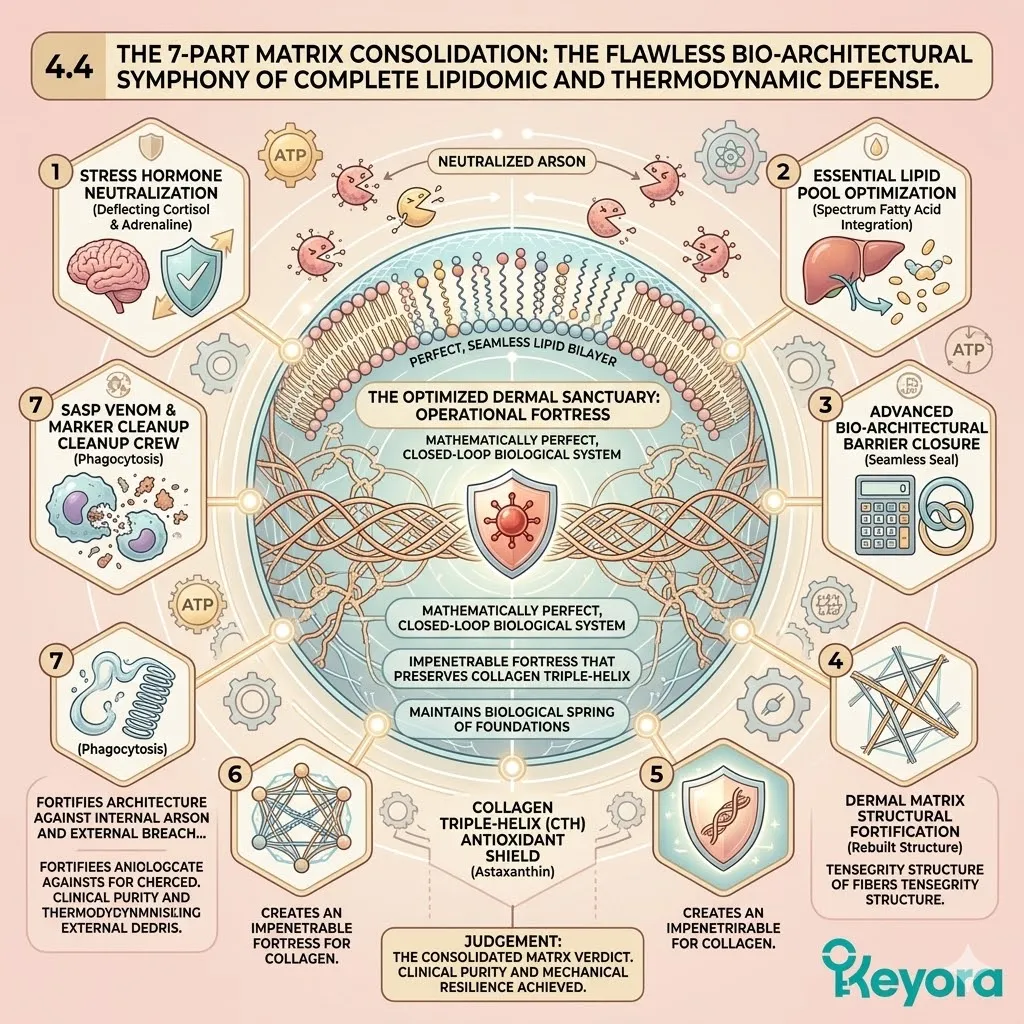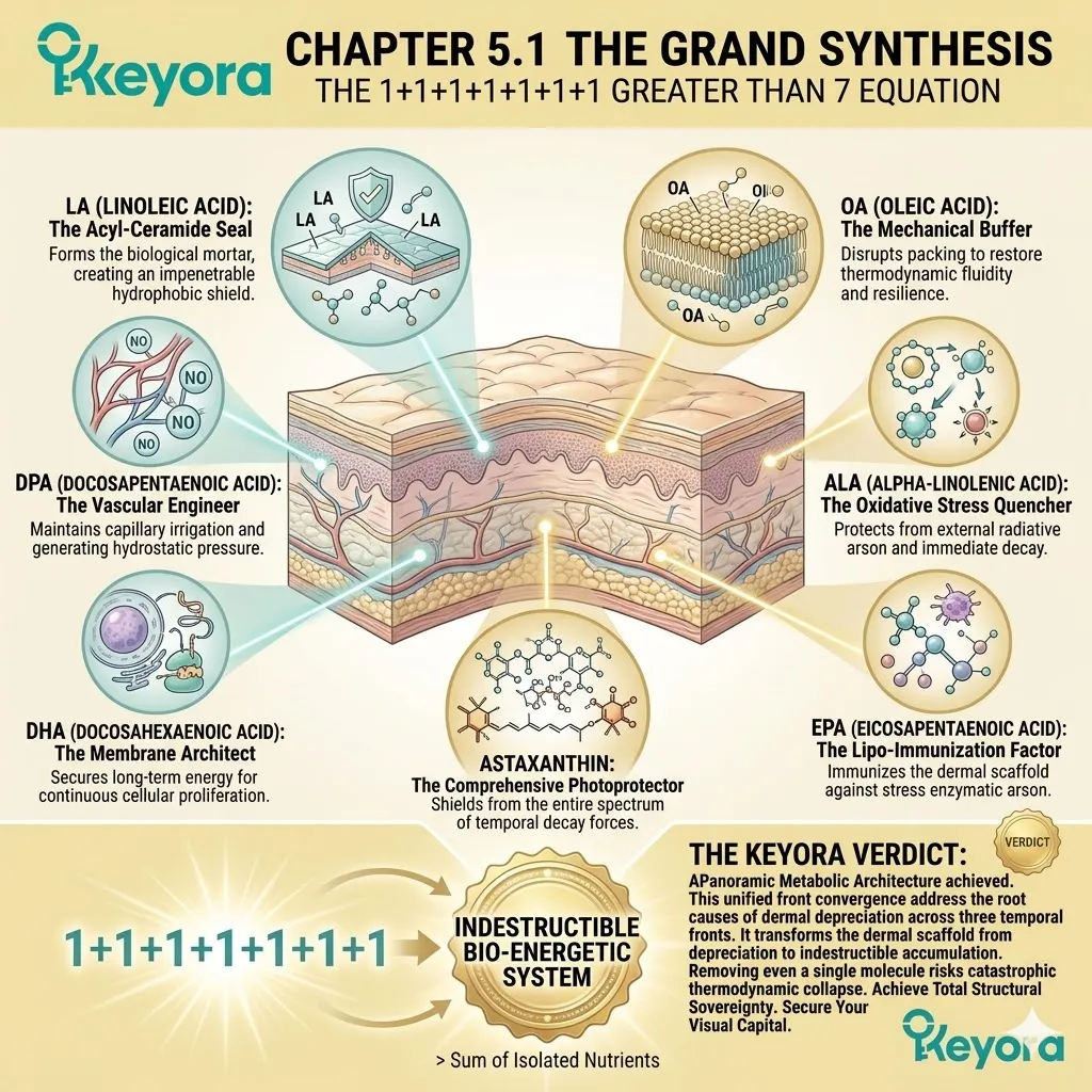 * **The Seven-Part Lipidomic Synergy:** The Keyora Matrix integrates **Astaxanthin, ALA, EPA, DHA, LA, OA, and DPA**; the removal of even one asset causes a catastrophic collapse of the anti-degradation fortress.