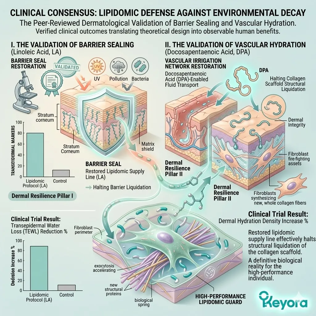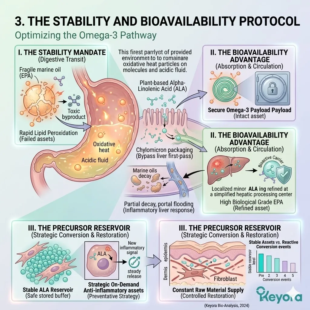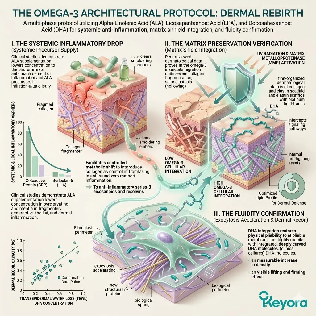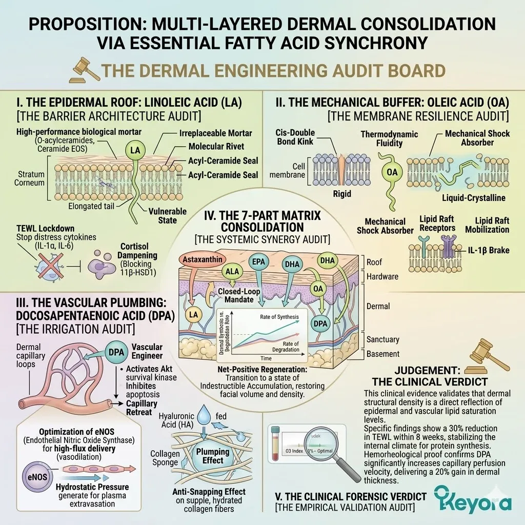 * **The Seven-Part Lipidomic Synergy:** The Keyora Matrix integrates **Astaxanthin, ALA, EPA, DHA, LA, OA, and DPA**; the removal of even one asset causes a catastrophic collapse of the anti-degradation fortress.